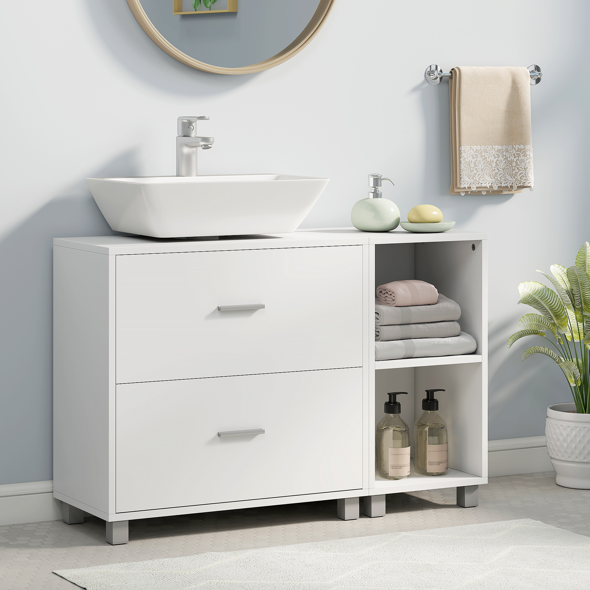 - DEPOZITARE INTELIGENTa sI DIVIZATa: Organizeaza-ti perfect baia cu acest dulap sub lavoar. Echipat cu doua sertare mari, fiecare cu doua compartimente pentru a pastra obiectele personale in siguranta, si doua rafturi deschise unde poti depozita prosoape si produse de toaleta la indemana.