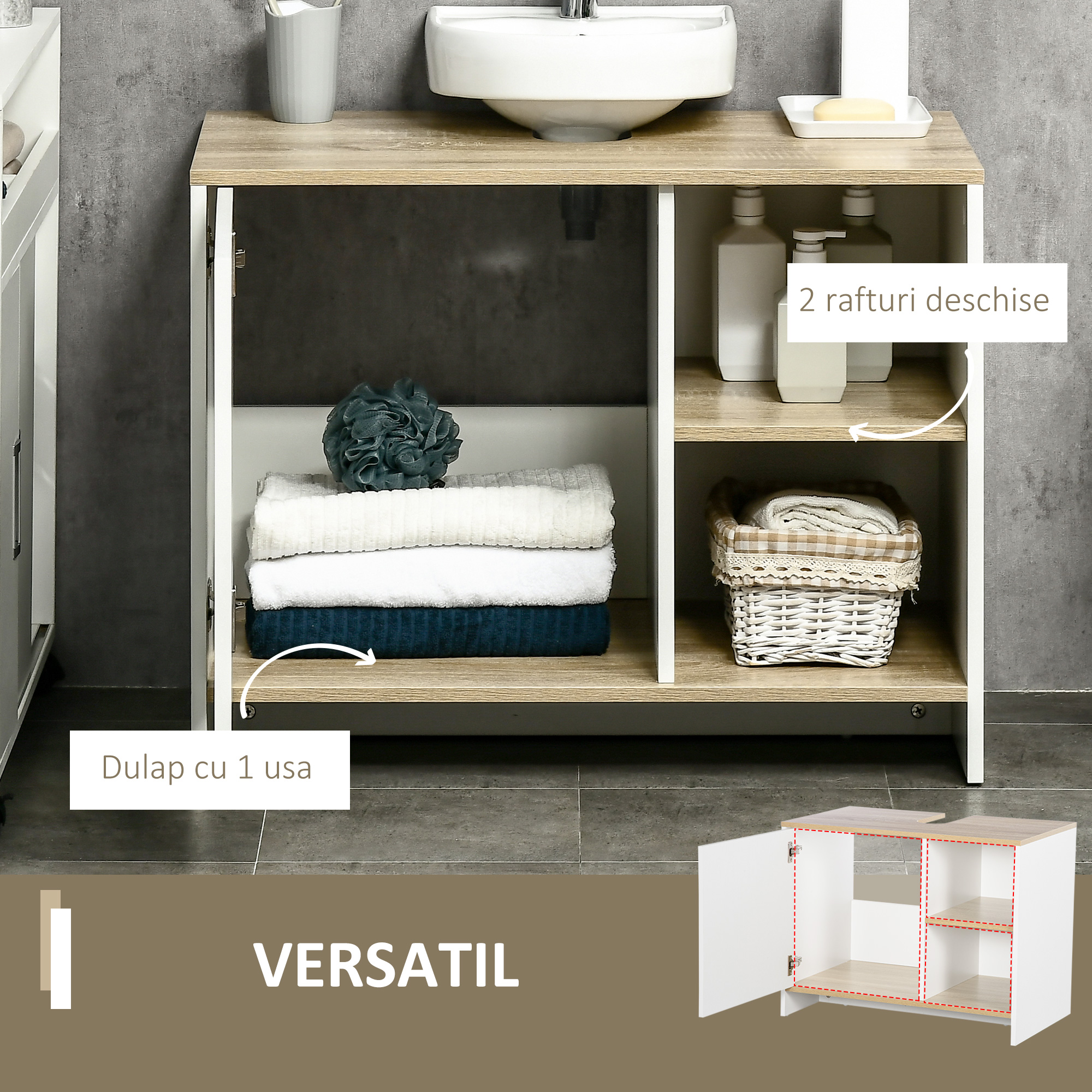 Pune un accent elegant in baia ta cu mobilierul pentru lavoar [BRAND NAME]. Combinatia dintre alb si culoarea lemnului il face ideal pentru a fi combinat cu alte articole de mobilier din baia ta. Baza inaltata iti faciliteaza curatarea podelei in baie. Dulapul cu o usa si 2 compartimente iti ofera mult spatiu pentru a depozita lucrurile de igienta si alte accesorii
