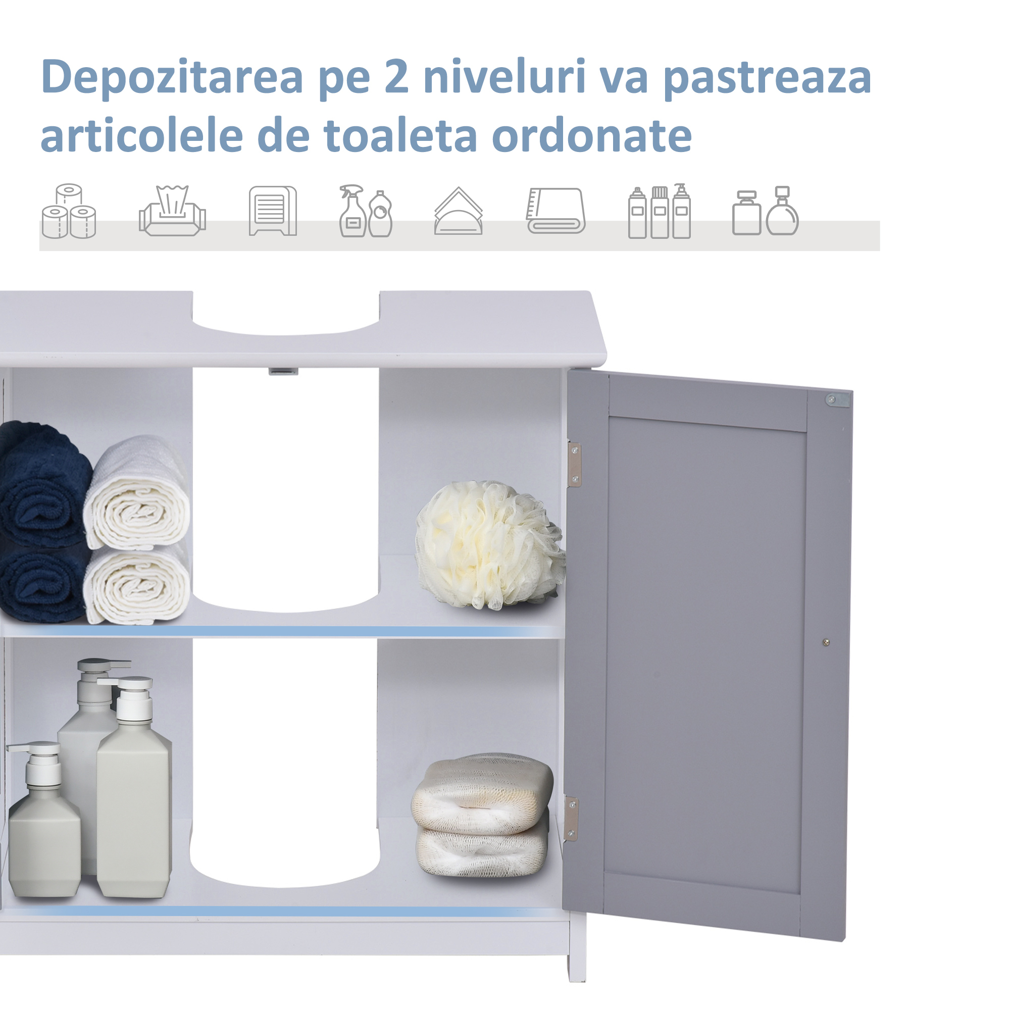 Extinderea spatiului din baia dvs. nu a fost niciodata mai usoara datorita dulapului de baie de sub chiuveta [BRAND NAME]. Cu liniile sale minimaliste si culorile gri si alb, se potriveste cu usurinta oricarui decor de baie. Este fabricat din panouri MDF rezistente si durabile si are o taietura in forma de U pentru a trece conducta lavoarului. Etajera reglabila din interiorul dulapului de baie va permite sa personalizati spatiul pentru a va depozita toate obiectele.
