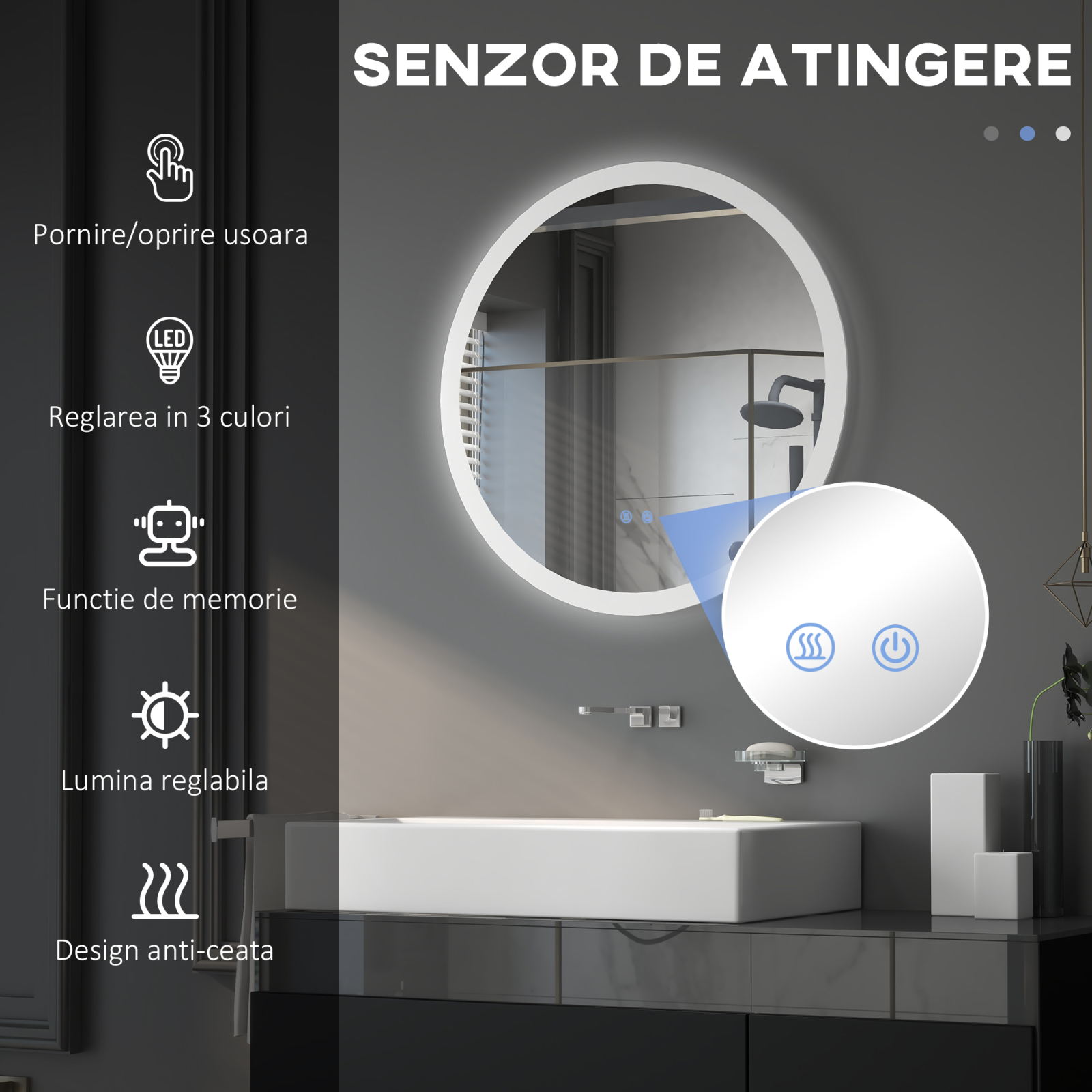 Oglinda Baie LED Anti-aburire cu 3 Culori si Luminozitate Reglabila, din Metal si Sticla, Ø70x3 cm