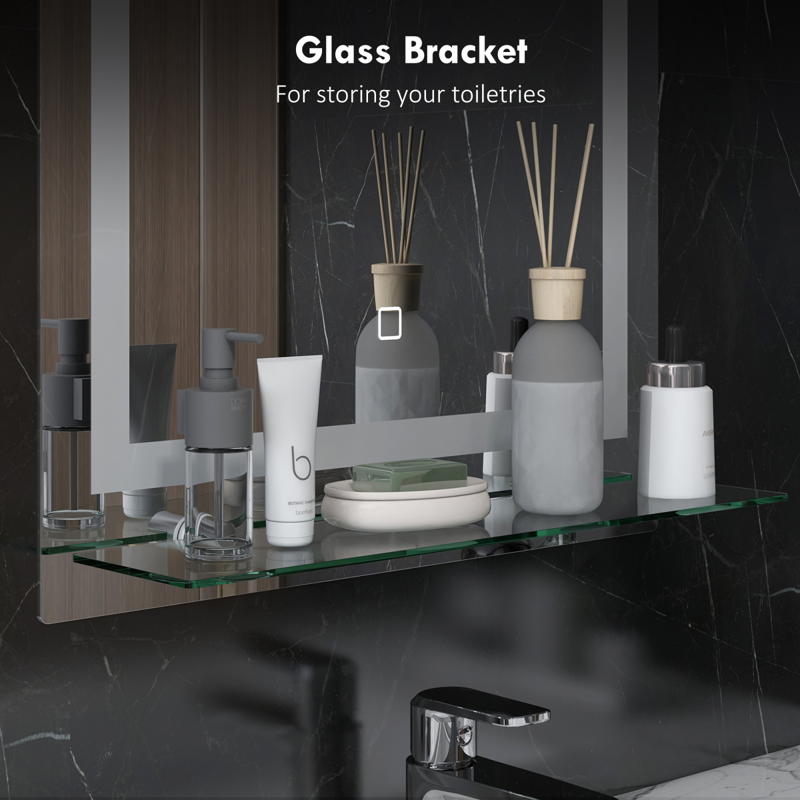 O baie moderna imbina designul si tehnologia pentru un rezultat de calitate. Accesoriile minimaliste si functionale, cum ar fi aceasta oglinda de baie [BRAND NAME] cu iluminare LED si intrerupator tactil, se caracterizeaza printr-un consum redus de energie. Realizata cu o structura din aluminiu rezistent la rugina si un raft practic din sticla pentru a organiza accesoriile de baie, oglinda noastra cu lumini poate fi usor montata pe perete datorita accesoriilor incluse pentru instalare.