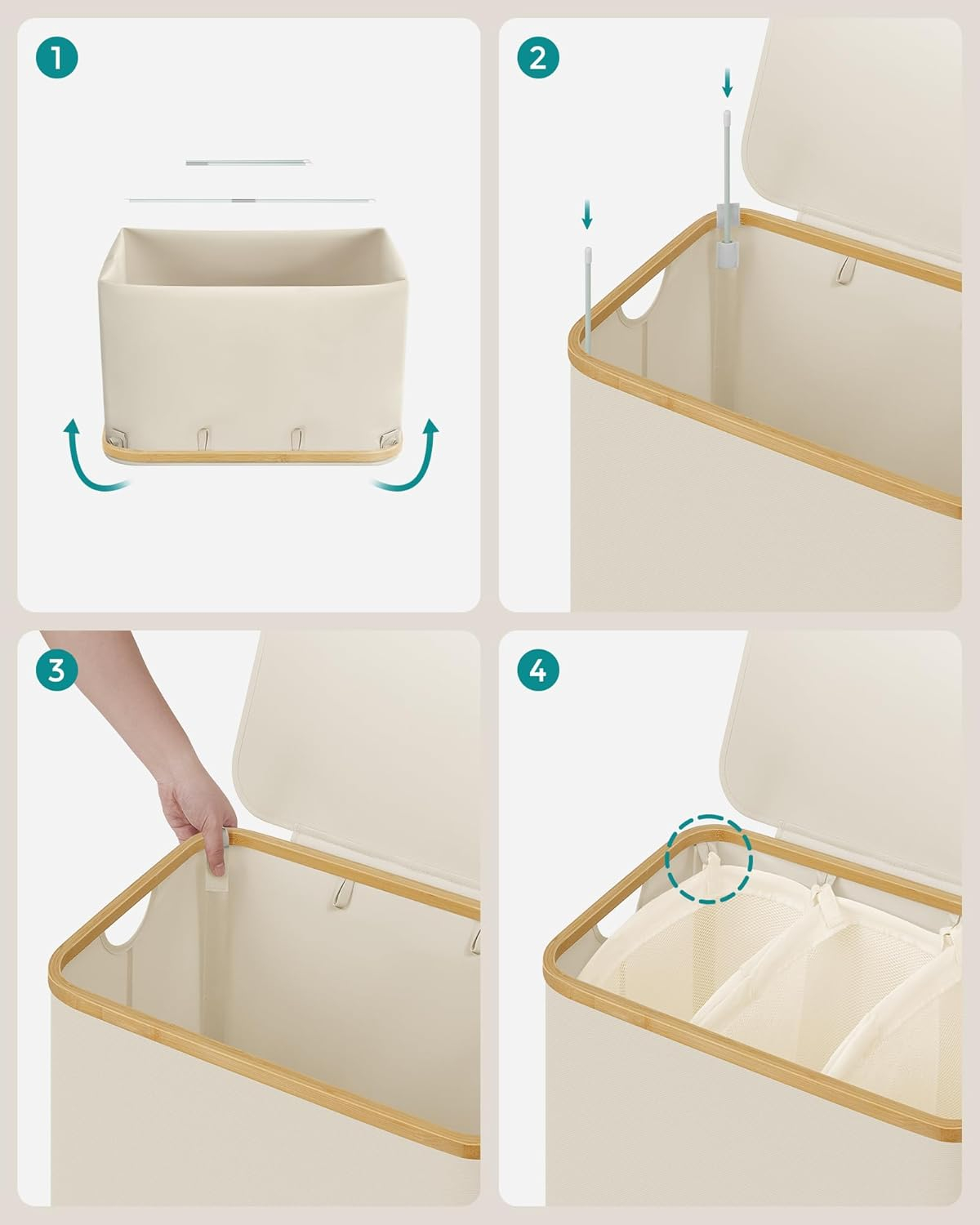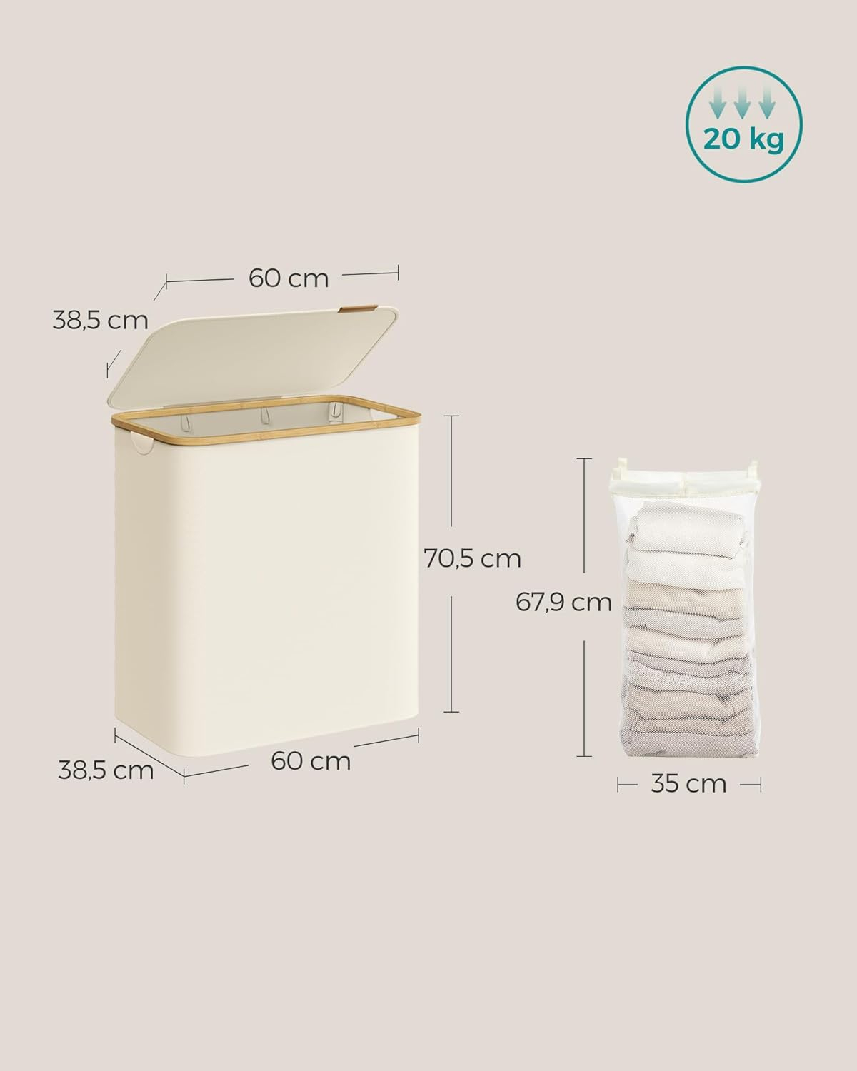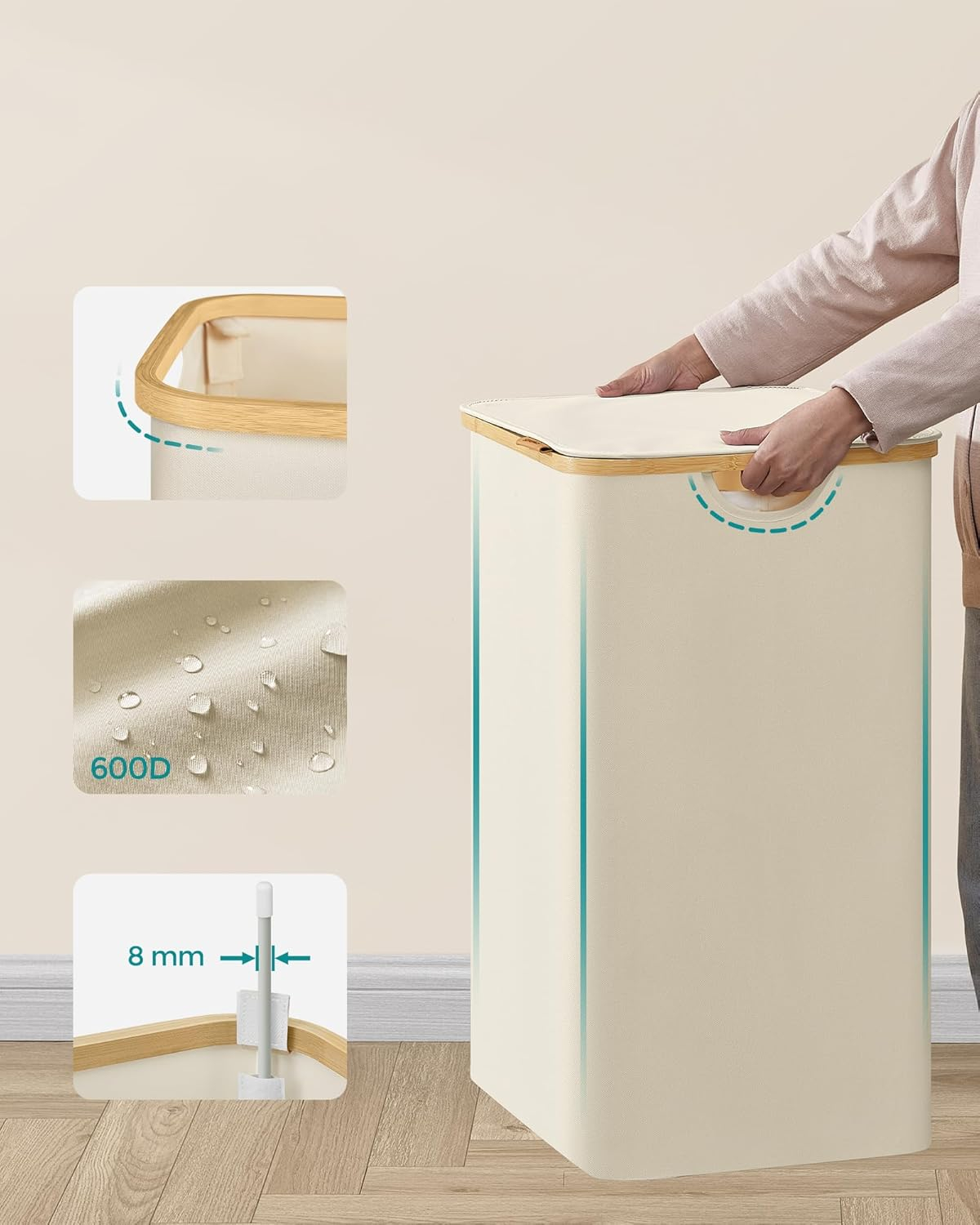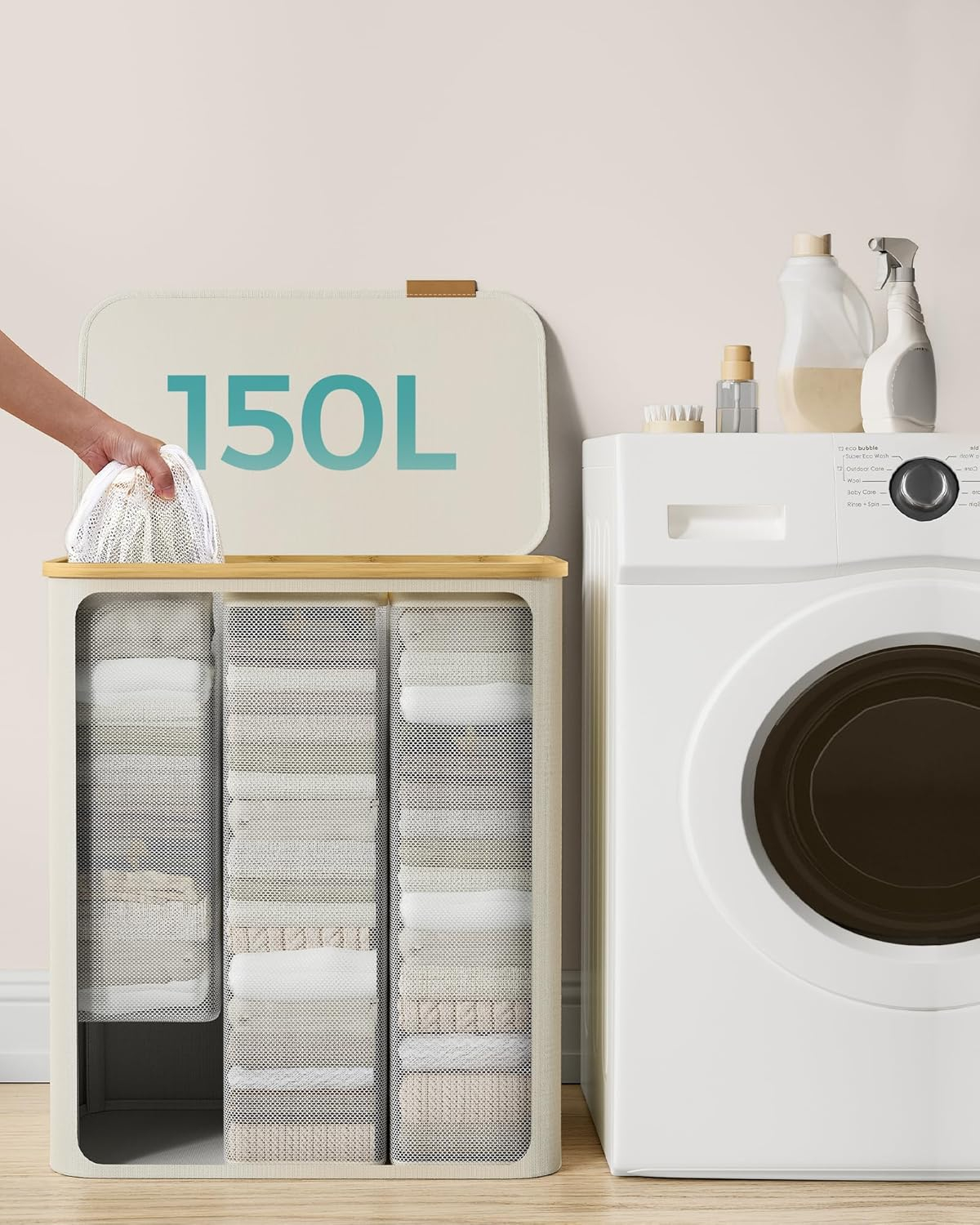 Cosul de rufe SONGMICS cu 3 compartimente este ideal pentru organizarea eficienta a hainelor, permitand sortarea acestora inca de la inceput. Cu o capacitate mare de 150L si design slim, se potriveste perfect in spatii compacte, oferind in acelasi timp functionalitate si un aspect elegant.