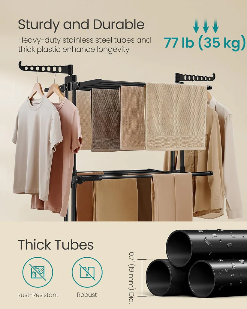 Usuca cantitati mari de rufe organizat si eficient cu acest uscator pe 4 niveluri din otel inoxidabil cu finisaj negru. Aripile laterale pivotante pentru umerase, raftul inferior pentru incaltaminte si rotile cu frana ofera functionalitate maxima intr-un design pliabil.