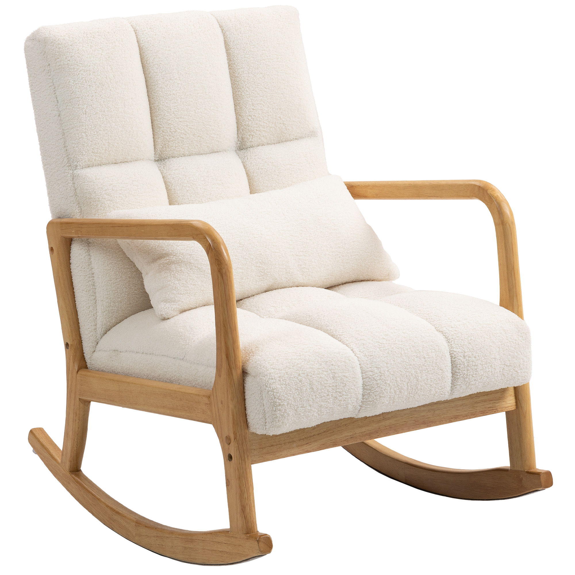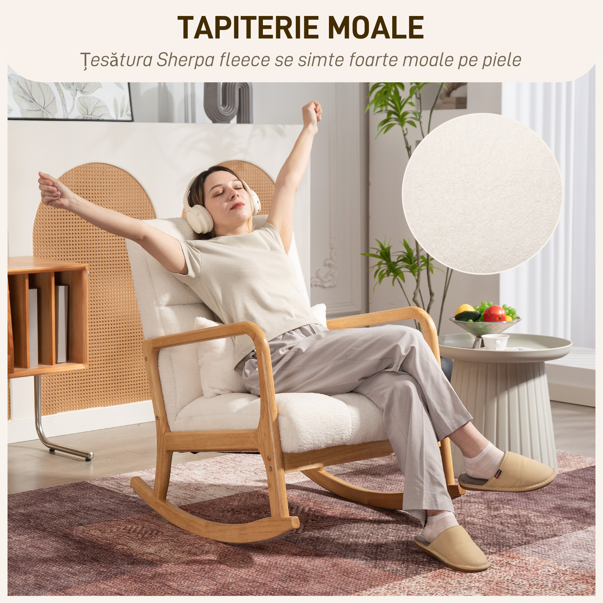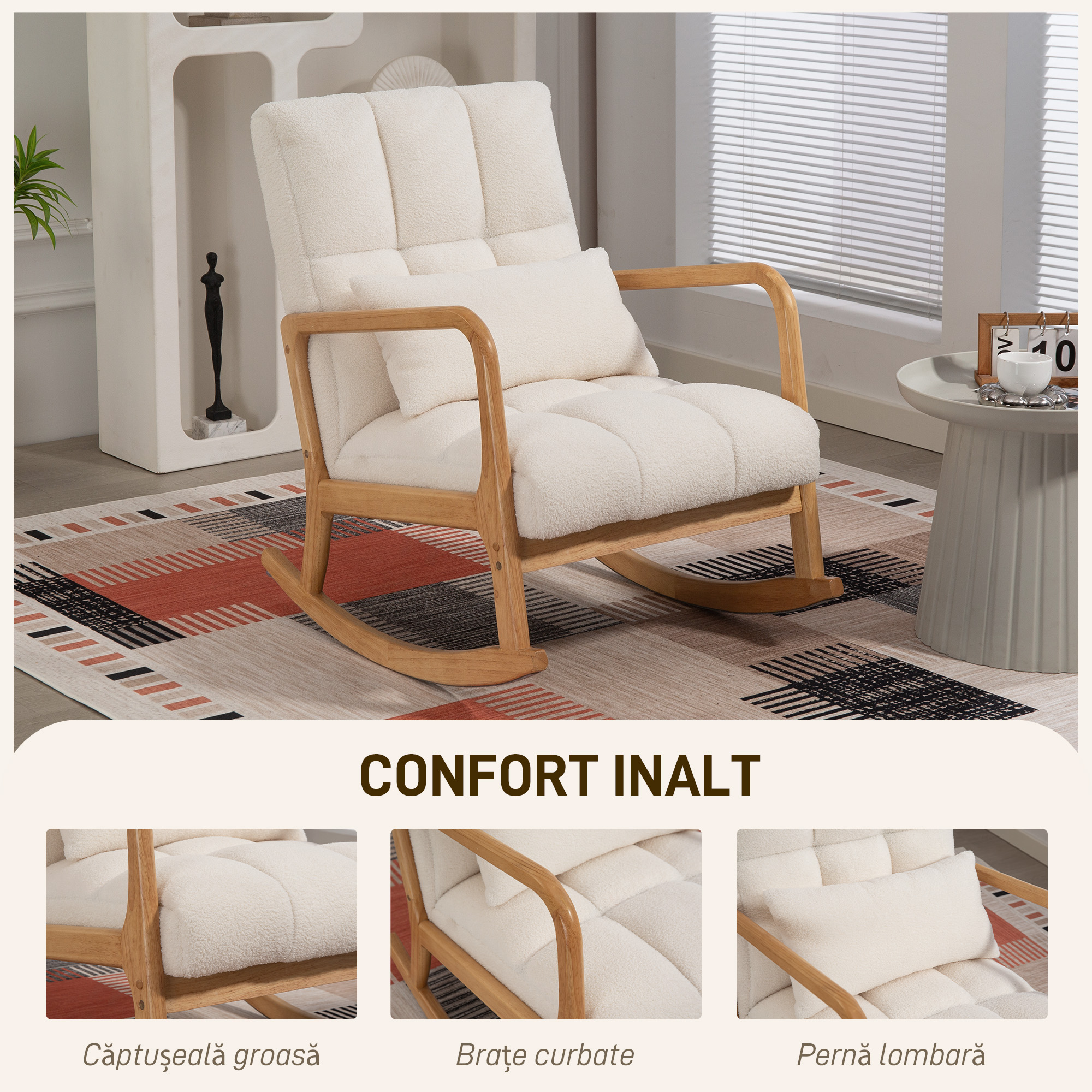 Scaunul balansoar [BRAND NAME] combina confortul moale cu un design elegant. Cu baza sa lunga, curbata din lemn de cauciuc, permite oscilarea intre 90° si 130°. Scaunul generos captusit si tapiteria din blana Sherpa ofera un refugiu relaxant. Bratele si spatarul curbat sprijina corpul si reduc stresul in timpul utilizarii. Materialul anti-alunecare si sistemele de siguranta pe baza asigura o balansare fara griji.
