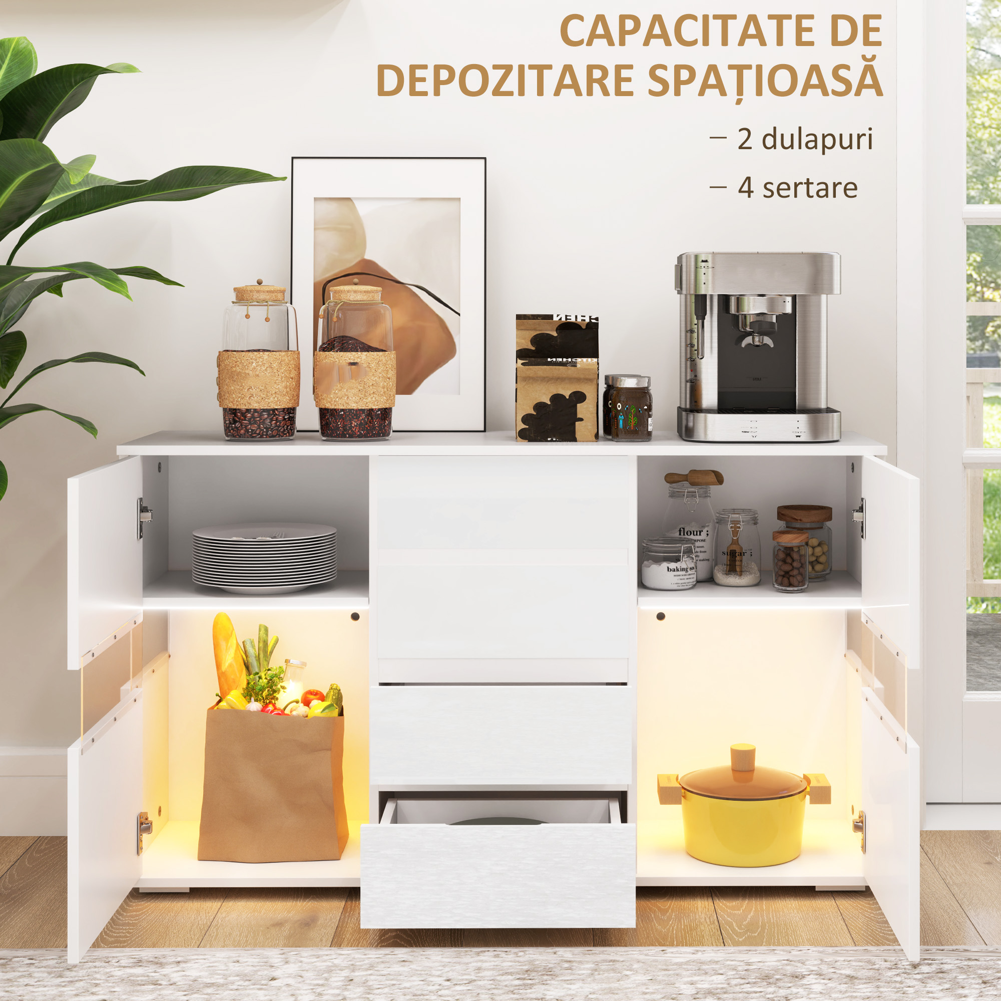 Bufetul modern [BRAND NAME] ofera multiple solutii pentru depozitarea obiectelor tale, datorita celor patru sertare spatioase si doua dulapuri. Iluminarea LED multicolora integrata, controlabila prin telecomanda, iti permite sa personalizezi aspectul mobilierului de bucatarie in functie de dispozitia ta si stilul casei tale. Perfect pentru cei care doresc un mediu elegant si organizat!