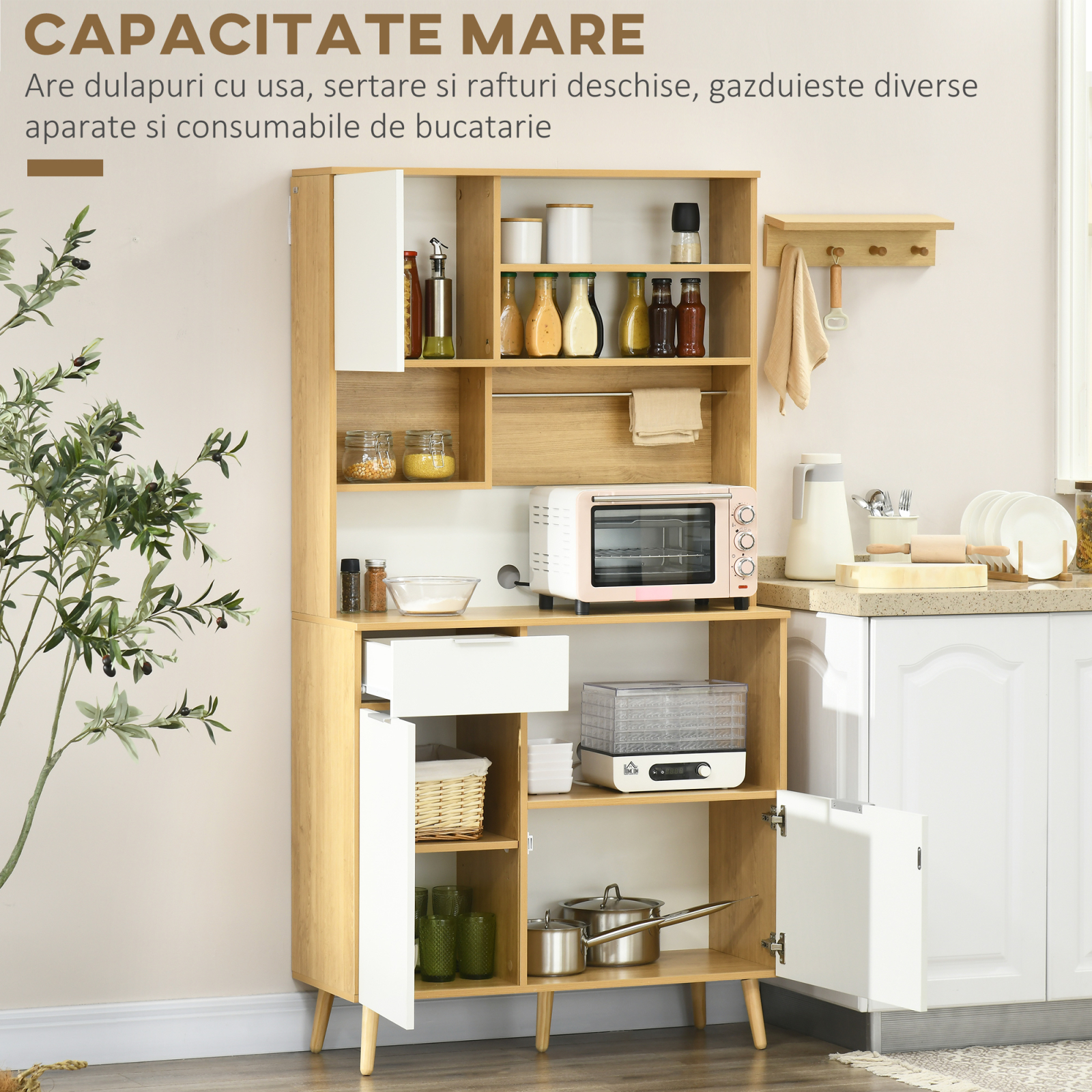 Acest dulap de bucatarie este o piesa practica si estetica pentru organizarea ustensilelor, vaselor si proviziilor. Include 3 usi, un sertar glisant si rafturi reglabile pentru flexibilitate maxima. Blatul superior deschis ofera un spatiu suplimentar pentru cuptor cu microunde, electrocasnice sau obiecte decorative. Designul modern il face usor de integrat in bucatarii functionale si luminoase.