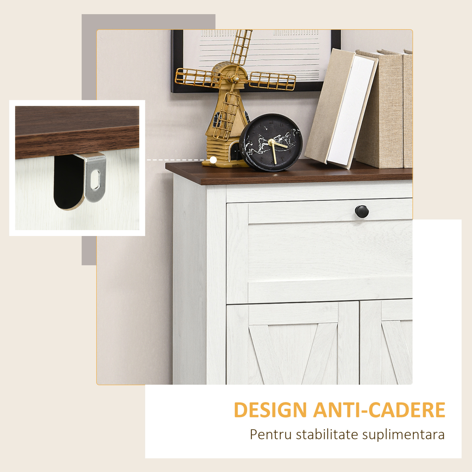 Pentru un plus de eleganta si ordine in casa ta, alege bufetul de bucatarie [BRAND NAME]. Cu un design rustic si simplu, acesta ofera un sertar spatios si un dulap cu doua niveluri, ideale pentru necesitatile tale. Combinatia dintre nuantele de lemn si alb se potriveste perfect cu diverse stiluri de amenajare interioara, adaugand un aspect rustic si minimalist decorului din livinguri, bucatarii, sali de mese si holuri.