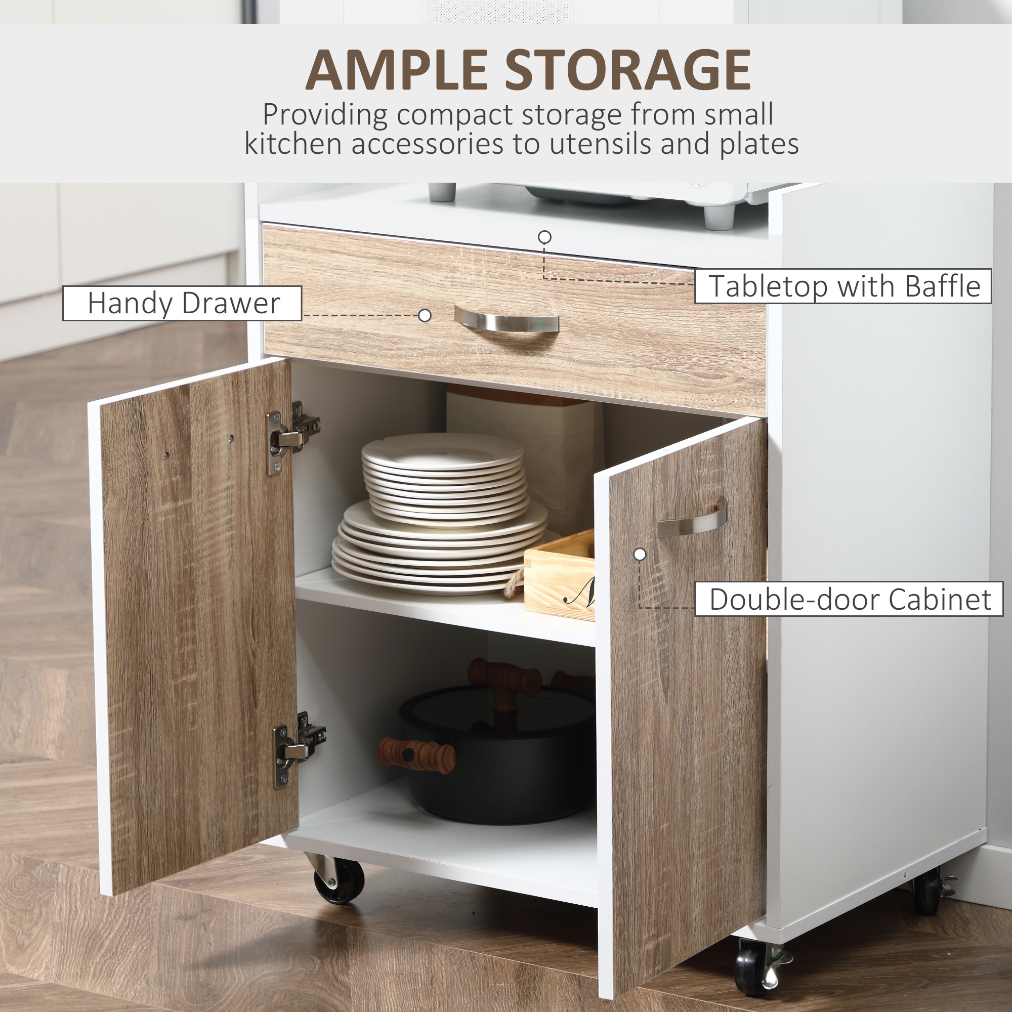 [BRAND NAME] carucior bucatarie, cu dulap si sertar, 60x40x77 cm va poate fi foarte util acasa daca aveti nevoie de un spatiu de depozitare. De asemenea, este si o piesa de mobilier inedita datorita combinatiei de culori. Acest carucior dispune de un dulap si de un sertar in care puteti aseza tot ceea ce aveti nevoie. [BRAND NAME] carucior bucatarie, cu dulap si sertar, 60x40x77cm dispune si de 4 roti. Doua dintre acestea pot fi blocate astfel incat sa pozitionati caruciorul exact acolo unde aveti nevoie.