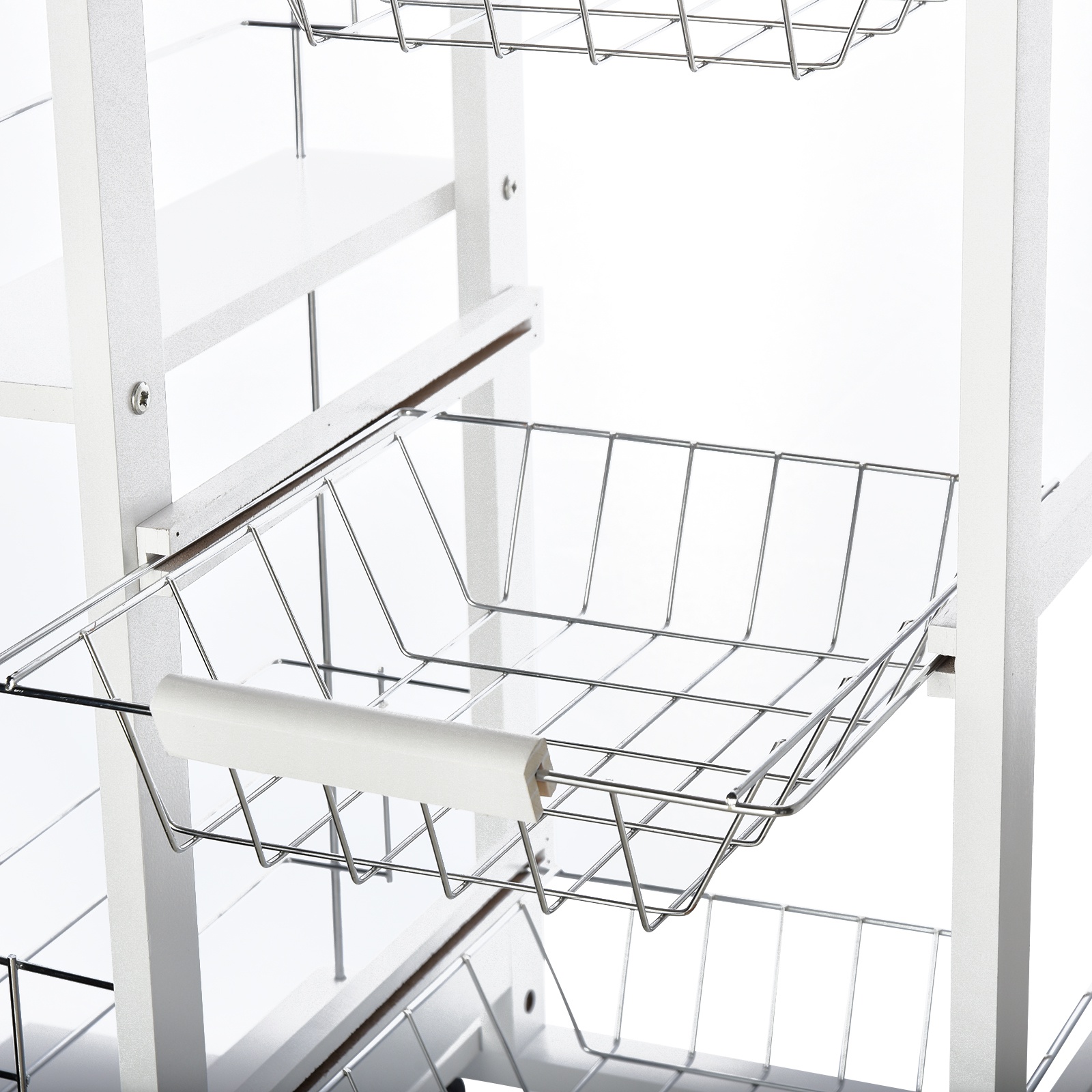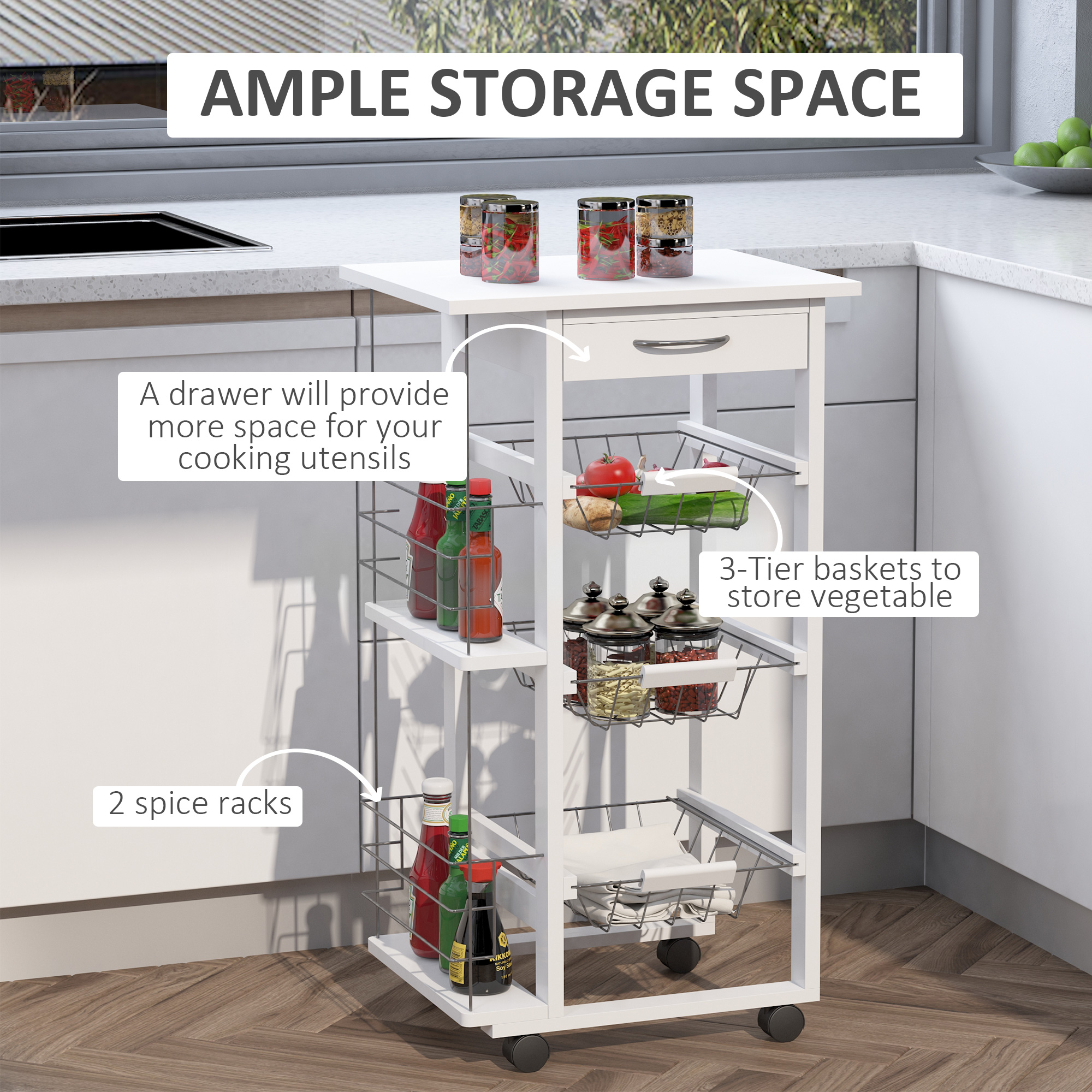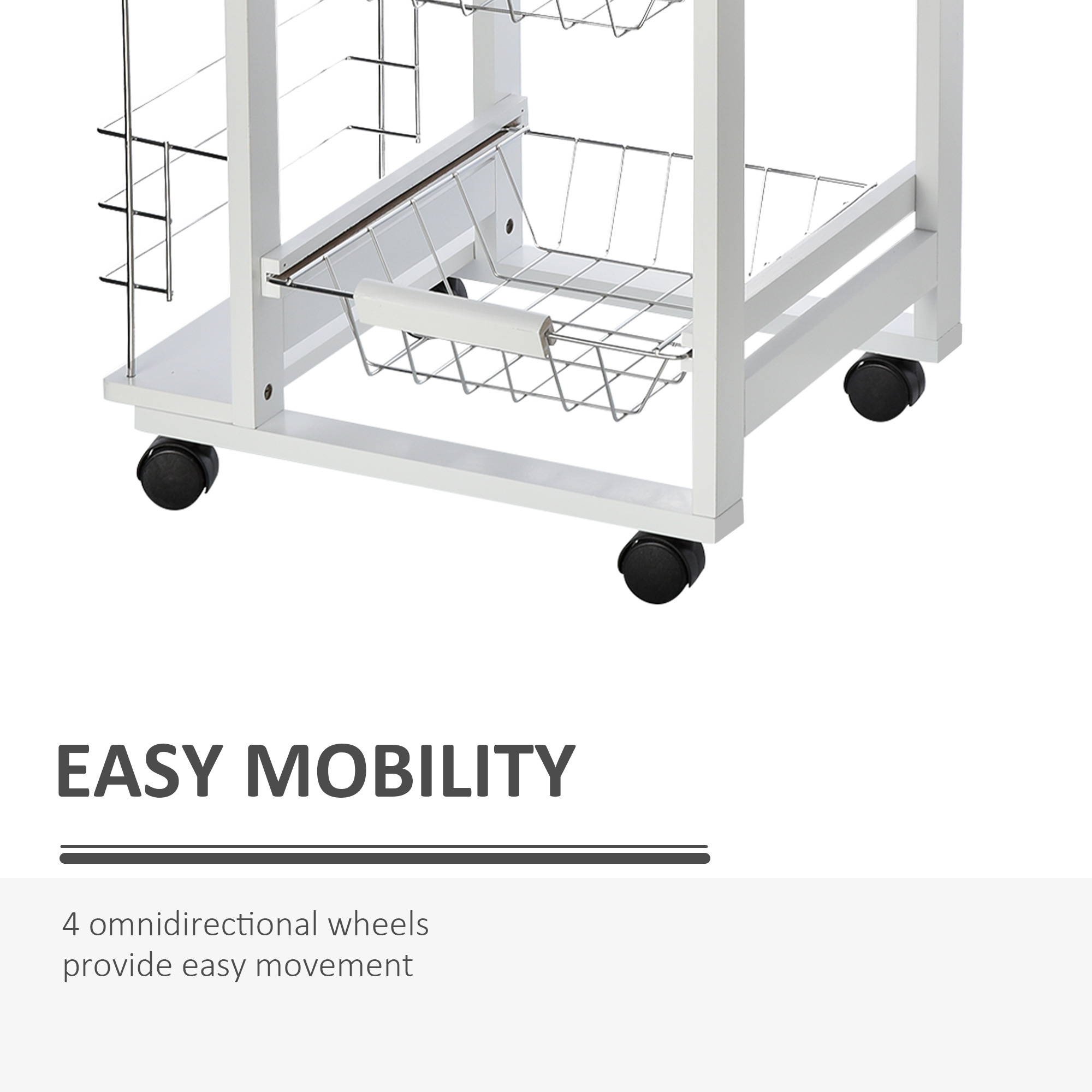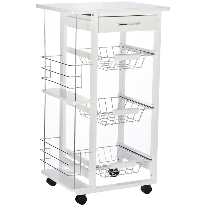 Iata caruciorul de bucatarie care iti simplifica viata! Un asistent indispensabil pentru gatit si pentru pastrarea intotdeauna in ordine a fructelor, legumelor, tacamurilor si accesoriilor de bucatarie. Este mereu la indemana. Are trei sertare confortabile detasabile din metal, un sertar si doua suporturi laterale pentru sticle pentru aranjarea condimentelor si mirodeniilor. Exista ceva mai practic?