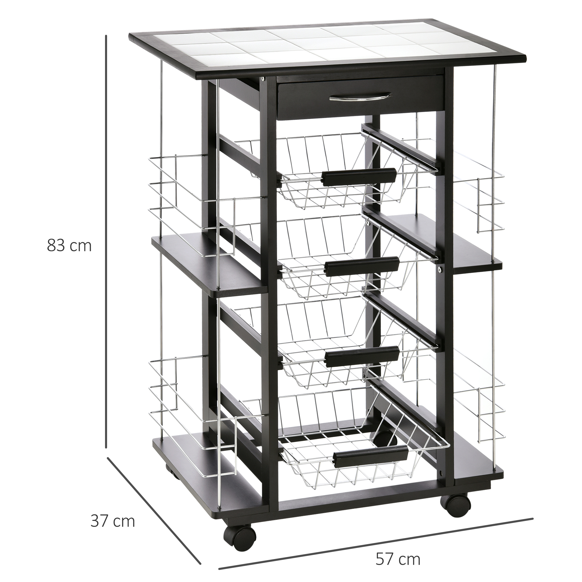 Ai nevoie de mai mult spatiu in bucatarie? Acest carucior pentru alimente [BRAND NAME] este suportul pe care il cauti. Datorita sertarului comod, celor 4 cosuri detasabile si celor 4 rafturi laterale, caruciorul nostru te va ajuta sa pastrezi totul mereu in ordine. Rezistent si functional, acest carucior de bucatarie este construit din lemn de pin si metal pentru a sustine pana la 50 kg si este dotat cu un blat acoperit cu placi de ceramica alba.