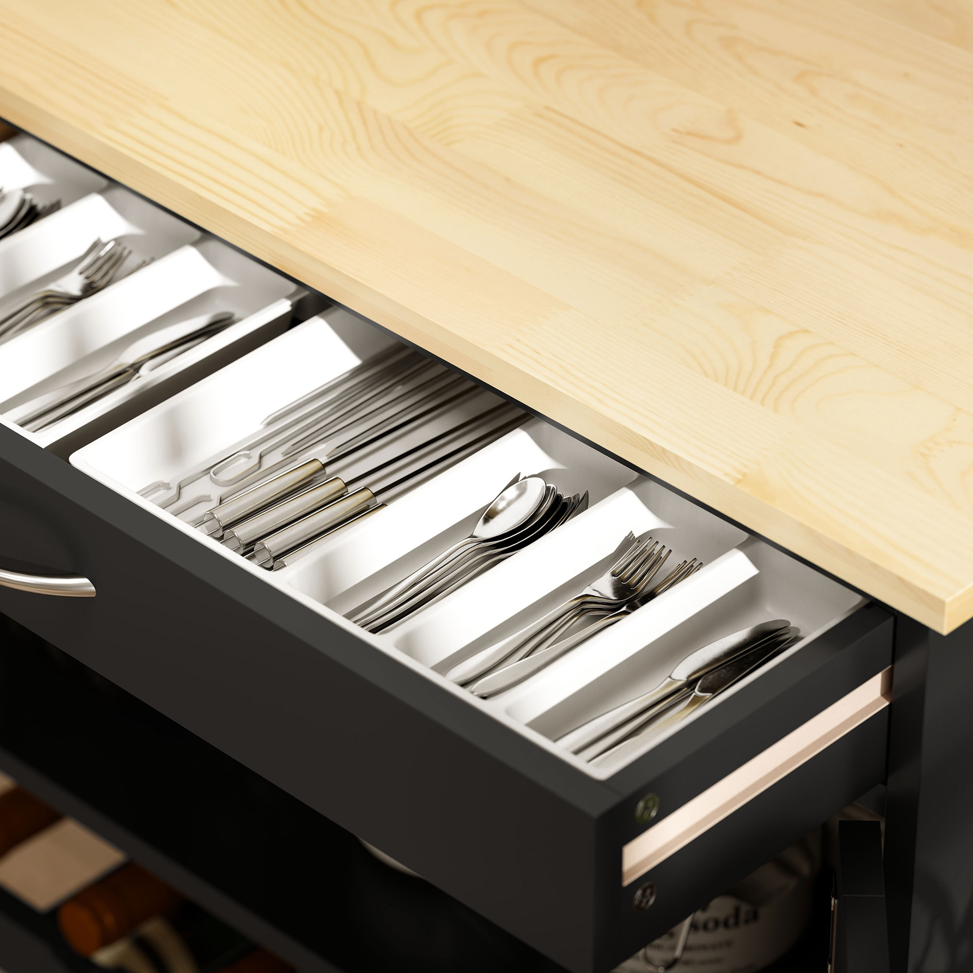 Acest carucior pentru servit mancarea [BRAND NAME] se va dovedi un ajutor indispensabil pentru activitatile tale din bucatarie! Structura este dotata cu un suport pentru sticle in care poti aseza pana la 9 sticle de vin, un sertar pentru tacamuri si 3 usi pentru a introduce farfurii, tavi si altele. Datorita culorii sale naturale si designului sau minimal, caruciorulse va potrivi perfect cu mobilierul bucatariei tale.