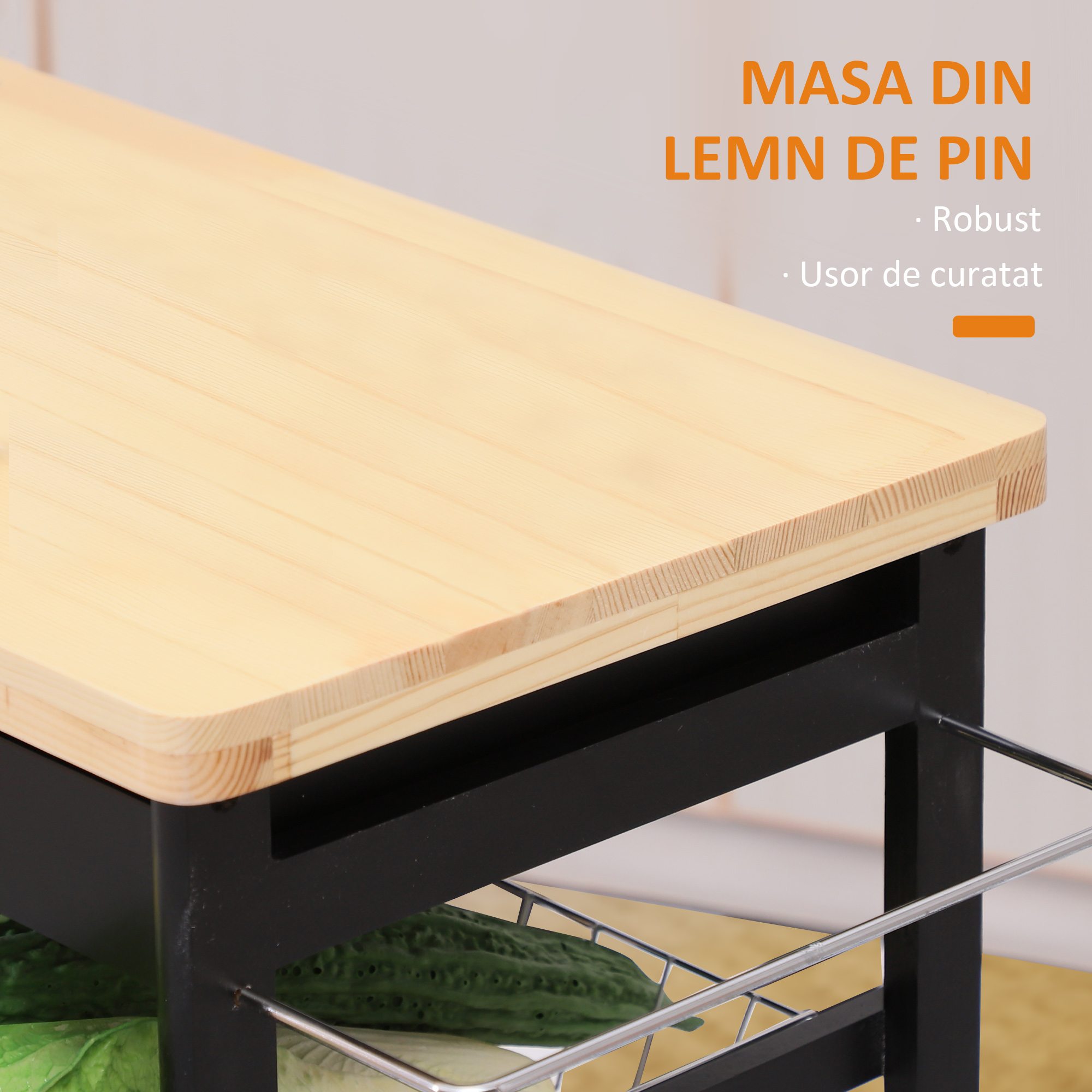 Caruciorul de bucatarie multifunctional [BRAND NAME] este perfect pentru gestionarea treburilor casnice si a gatitului. Dispunand de un blat robust din pin si un finisaj neted din MDF, acest carucior este atat elegant, cat si practic. Doua cosuri ofera spatiu de depozitare pentru fructe, ustensile, iar un suport pentru 6 sticle va mentine organizate bauturile preferate. Acest carucior este perfect pentru familiile care apreciaza un spatiu ordonat si estetic.