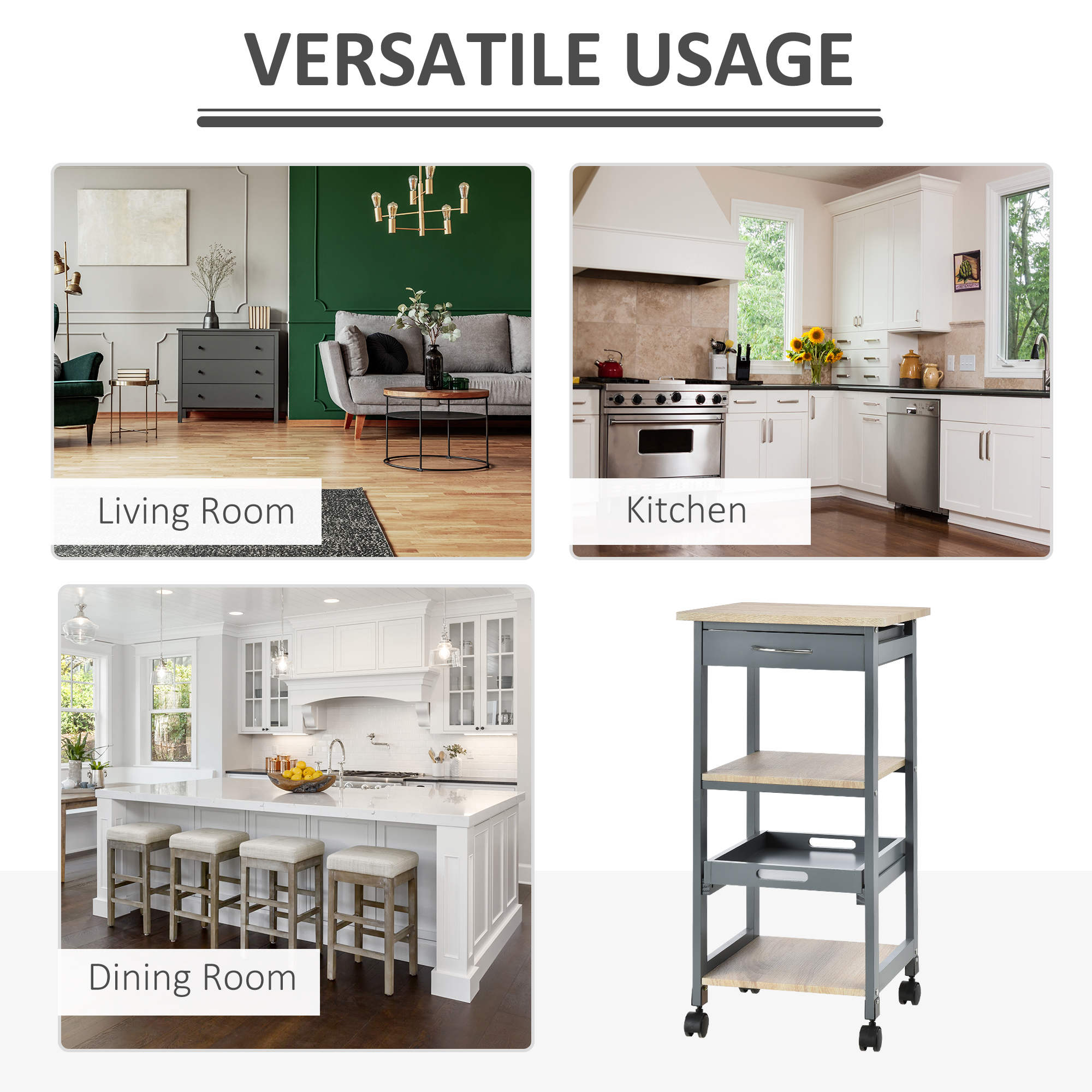 Acest carucior mic de bucatarie [BRAND NAME] este un accesoriu de mobilier perfect pentru orice nevoie. Dotat cu o suprafata de lucru practica, doua rafturi, un sertar si o tava detasabila, caruciorul cu alimente se deplaseaza confortabil oriunde aveti nevoie, datorita celor 4 roti pivotante. Datorita schemei de culori neutre, aceasta insula de bucatarie se imbina bine cu fiecare mobilier.