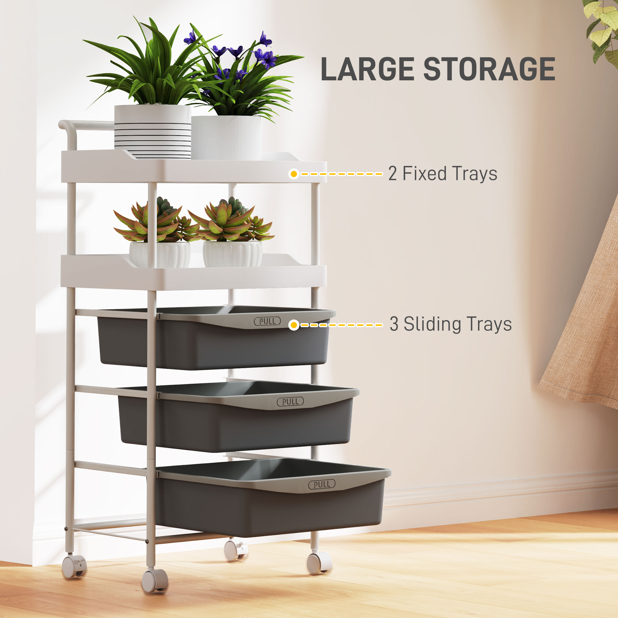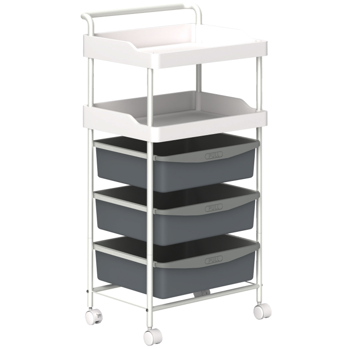 Muta obiecte si alimente dintr-o parte in alta fara efort cu caratul portabil [BRAND NAME]. Acest suport practic este dotat cu 2 rafturi fixe si 3 rafturi culisante care te vor ajuta sa elimini dezordinea. Rotile sale, doua dintre care sunt prevazute cu frana pentru a se opri stabil, il fac sa se deplaseze dintr-o camera in alta fara probleme. Poate fi utilizat in toate camerele casei sau biroului, astfel incat sa vina in intampinarea nevoilor tale.