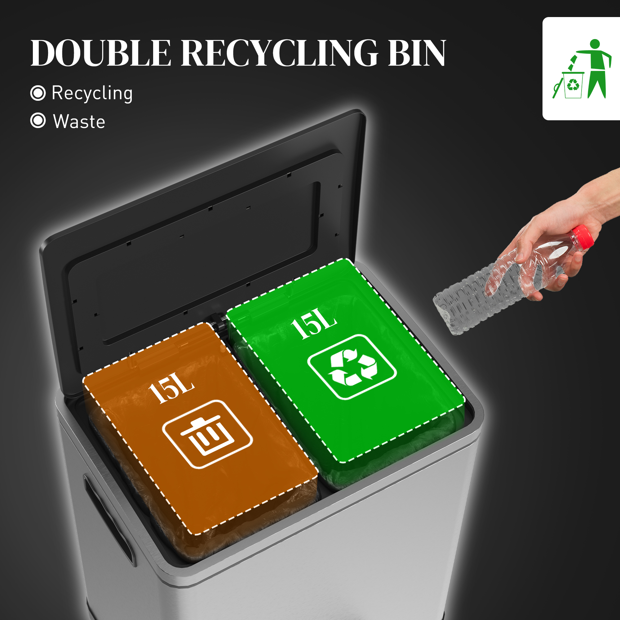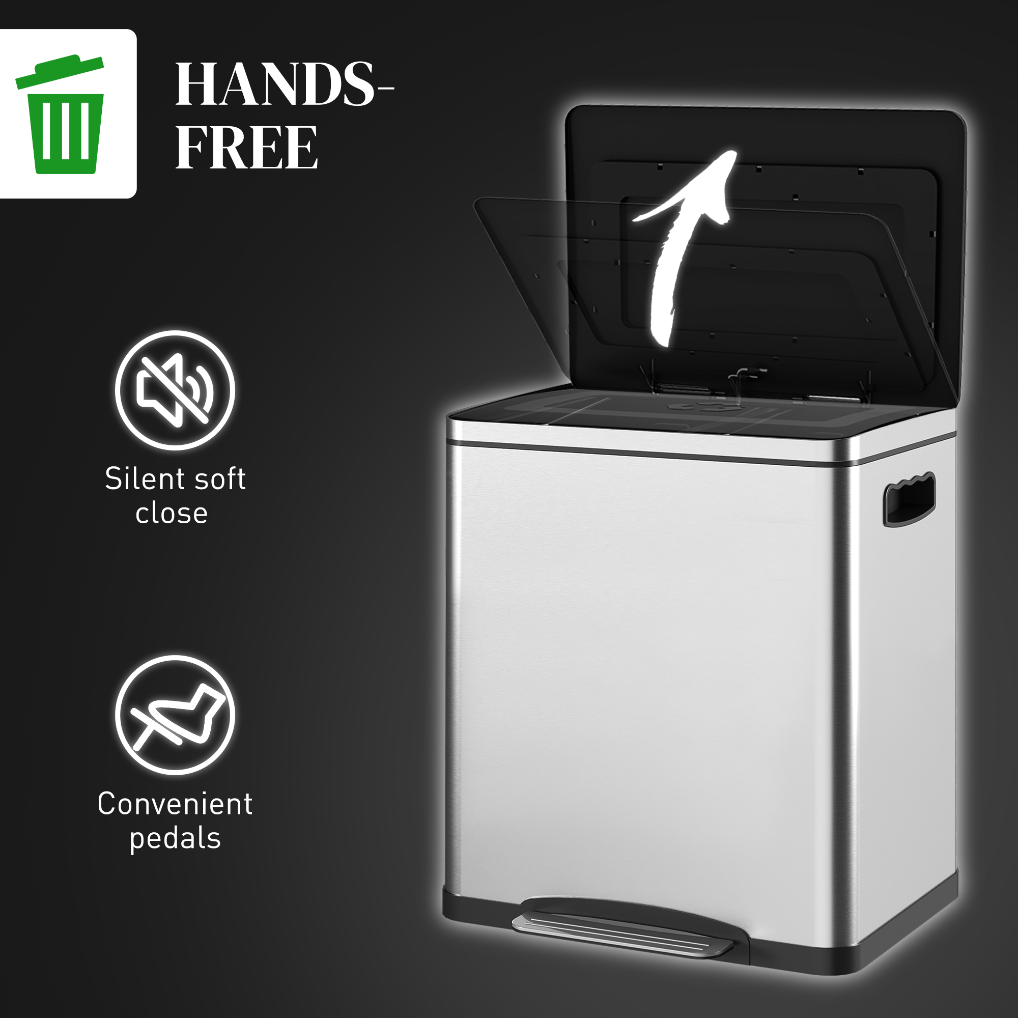 Cos de Gunoi cu 2 Sectiuni de 15L cu Pedala si Capac cu inchidere Lina, 40x34,8x47,5 cm, Argintiu