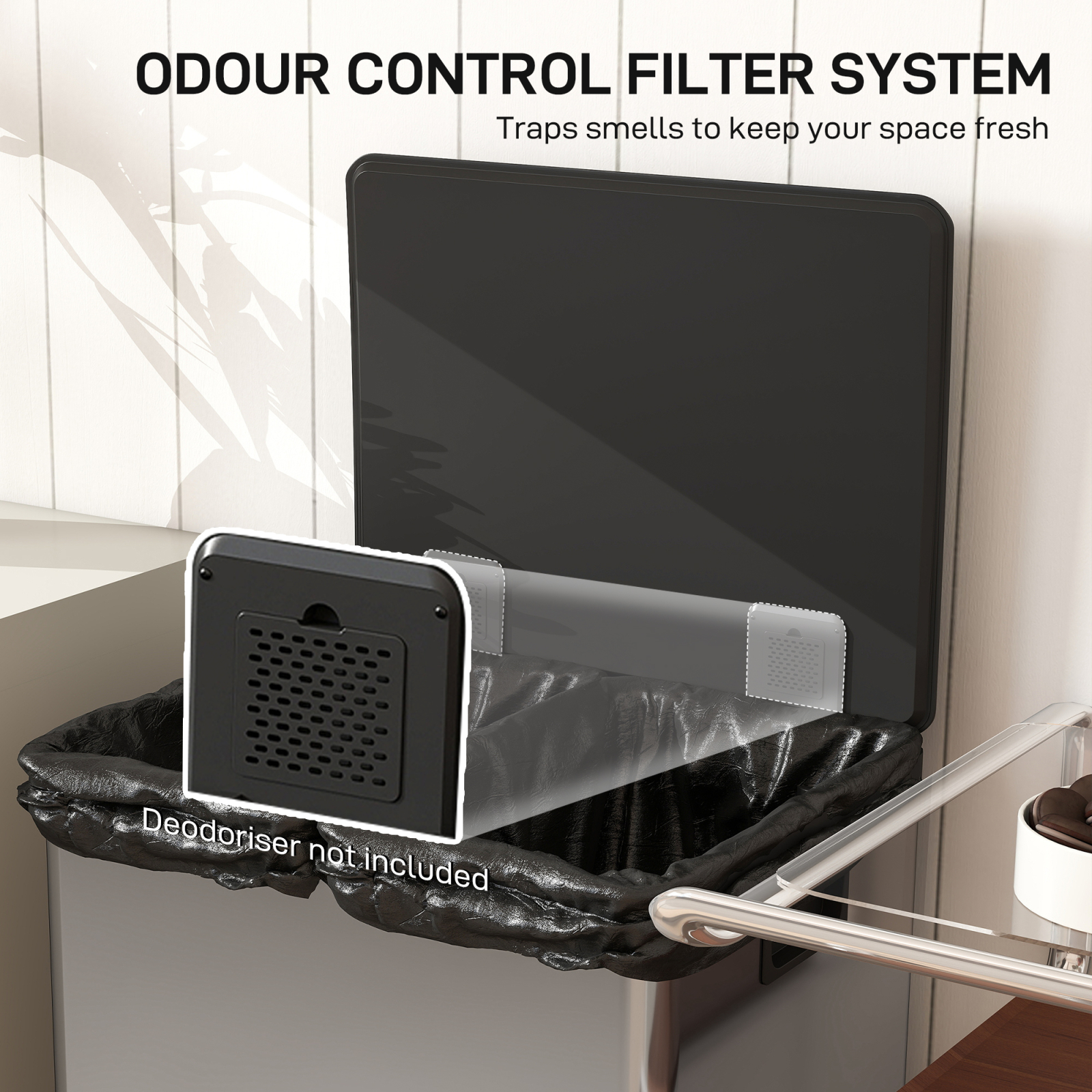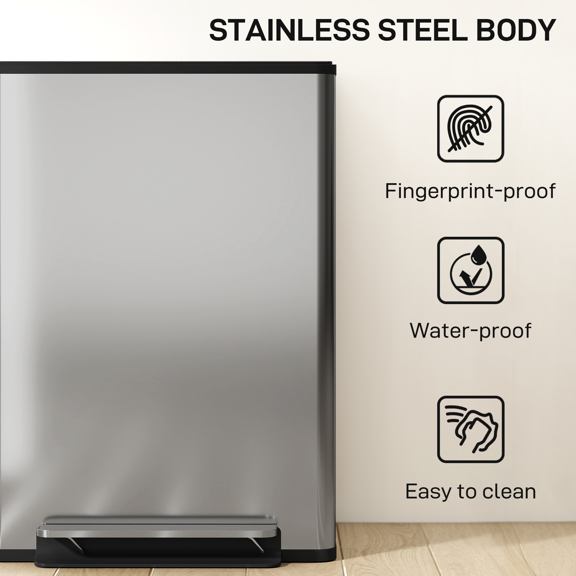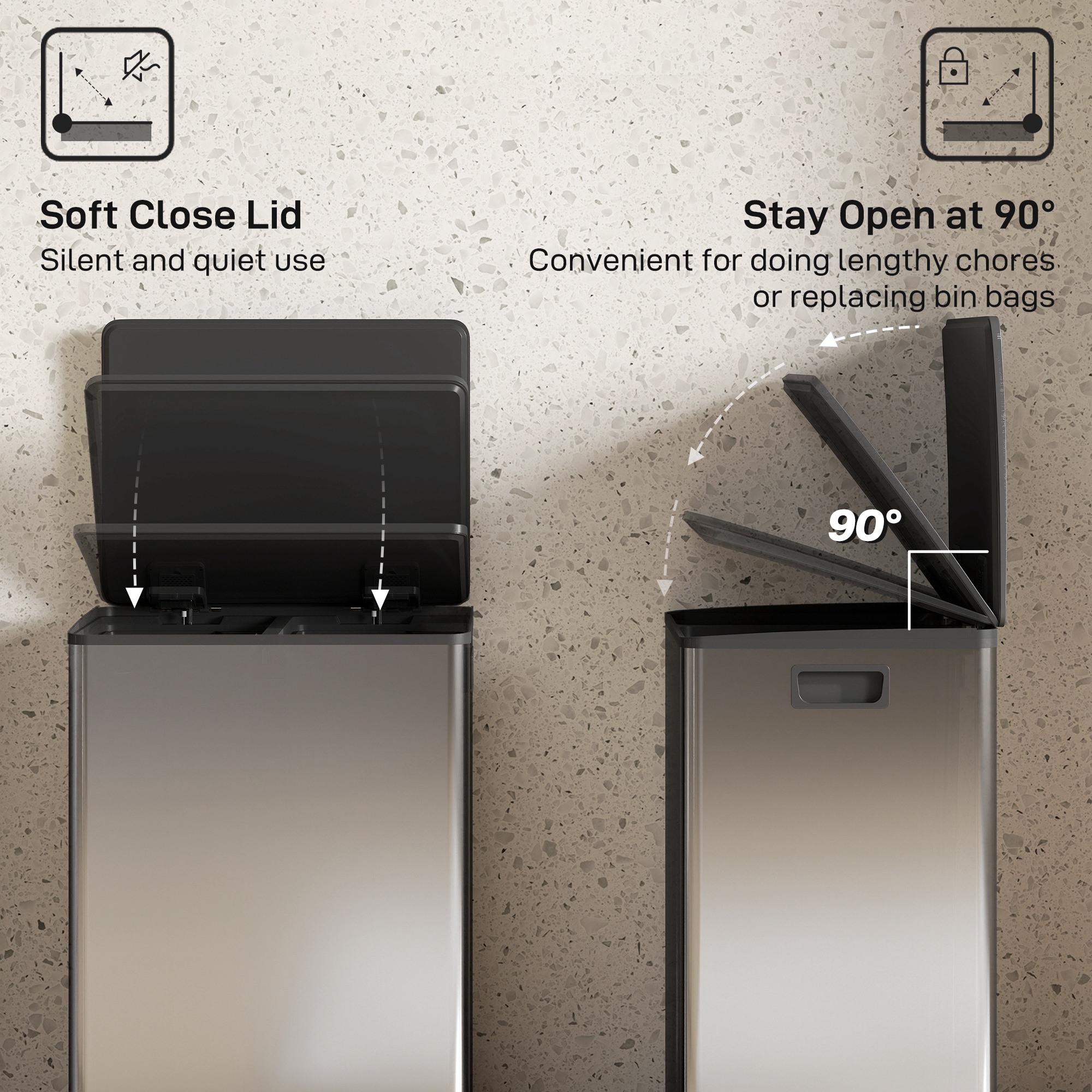 Spune adio haosului in gestionarea deseurilor: cosul de gunoi [BRAND NAME] cu compartiment dublu asigura separarea usoara a deseurilor si este dotat cu un capac care ramane deschis in timpul pregatirii meselor si se inchide fara zgomot. Corpul din otel inoxidabil periat al cosului de reciclare rezista la pete si, datorita designului sau simplu si minimalist, se integreaza discret in orice mediu.