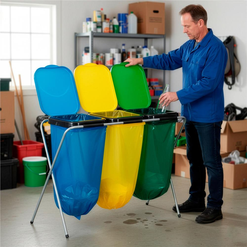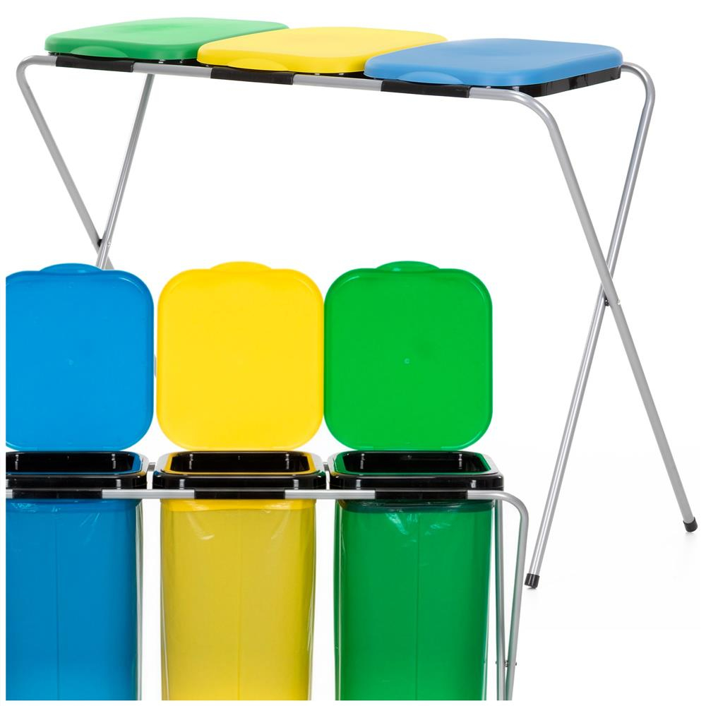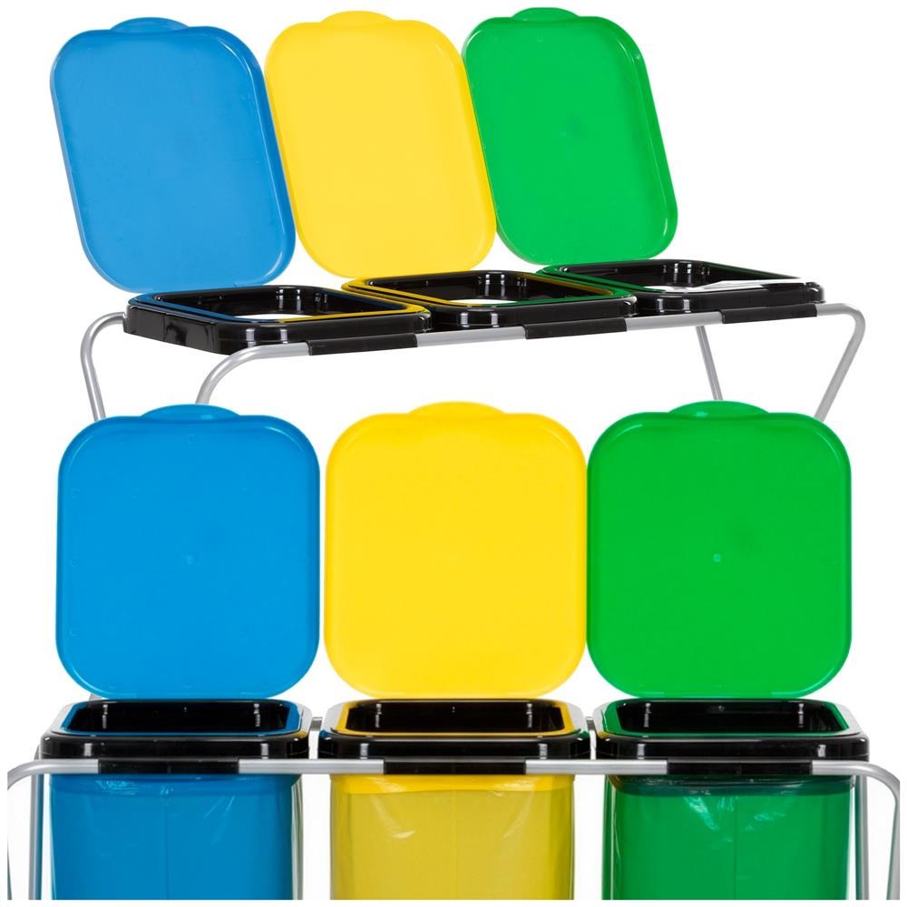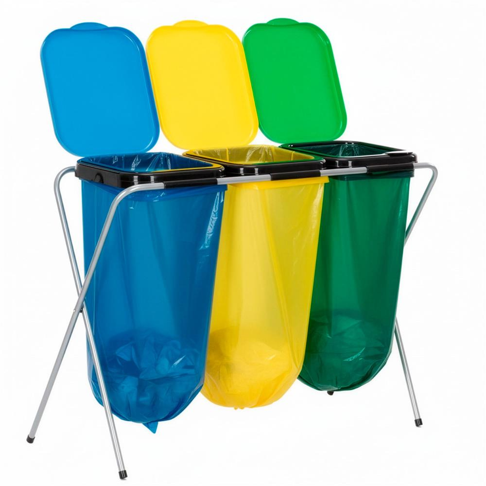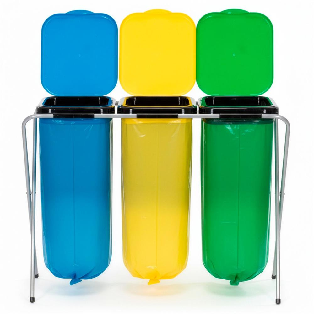 Specificatii tehnice: Material: Metal, PP Culoare cadru: Gri Culoare capace: Verde, galben, albastru Numar compartimente: 3 Incarcare maxima: 30 kg Dimensiuni generale: Latime totala: 98 cm Adancime totala: 42,5 cm Inaltime totala: 74 cm Structura cadru: Diametru profile metalice: 1,5 cm Distanta intre picioare pe latime: 90 cm Distanta intre picioare pe adancime: 39 cm Dimensiuni capace: Latime capac: 29,5 cm Inaltime capac: 35,5 cm Grosime margini capac: 0,2 mm Scurta descriere: Cos de gunoi cu 3 compartimente, conceput pentru colectarea selectiva a deseurilor. Structura metalica este stabila si usoara, iar capacele din PP sunt prevazute cu clapeta interioara pentru fixarea sacilor. Solutie practica pentru bucatarie, balcon sau spatii utilitare. Caracteristici principale: 3 compartimente pentru sortarea deseurilor Cadru metalic stabil si usor Capace cu clapeta pentru fixarea sacului Sistem de montare prin glisare Picioruse antialunecare pentru stabilitate Design practic pentru utilizare zilnica