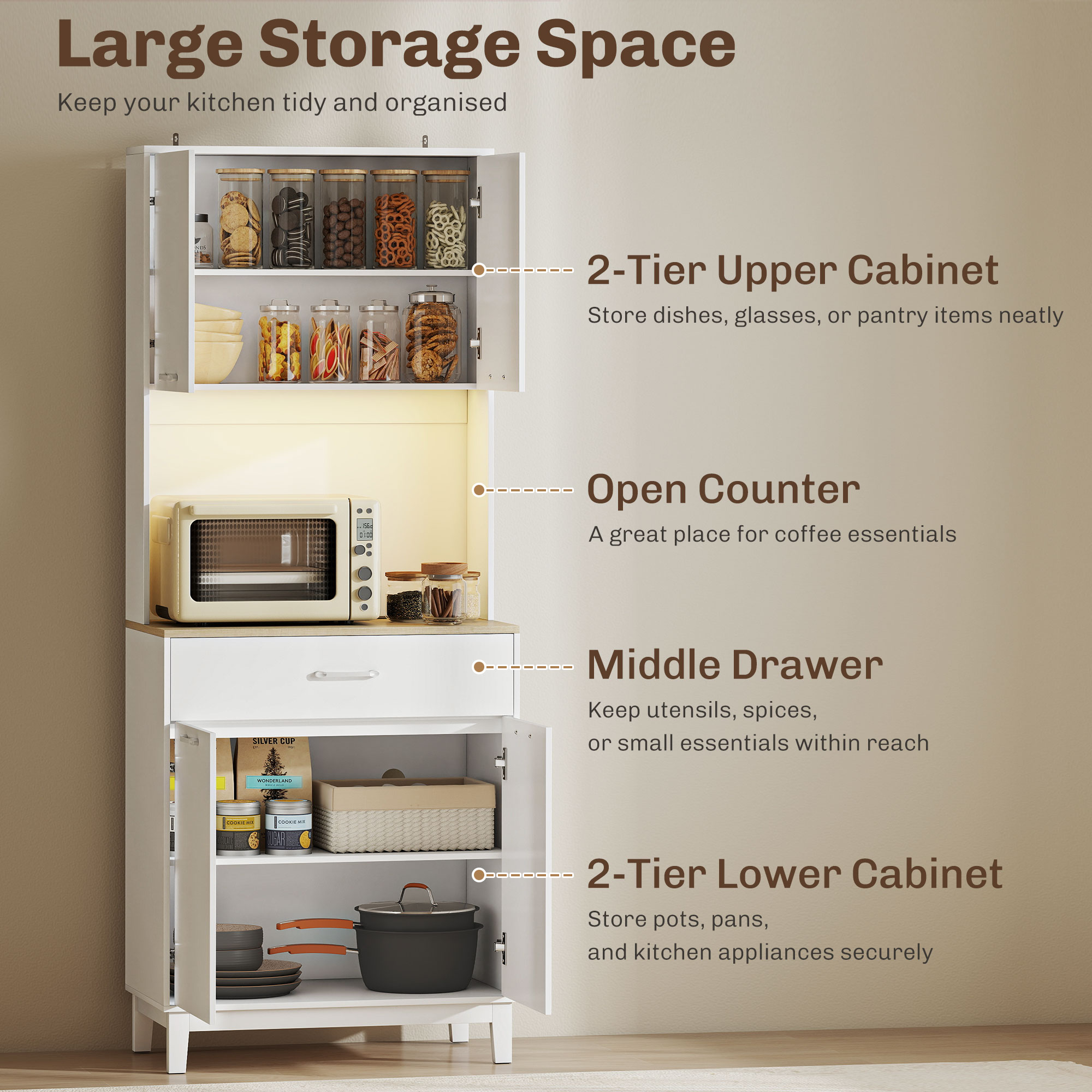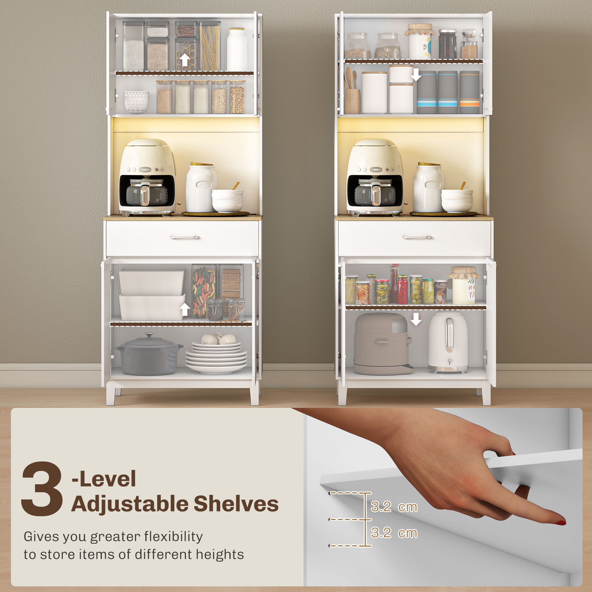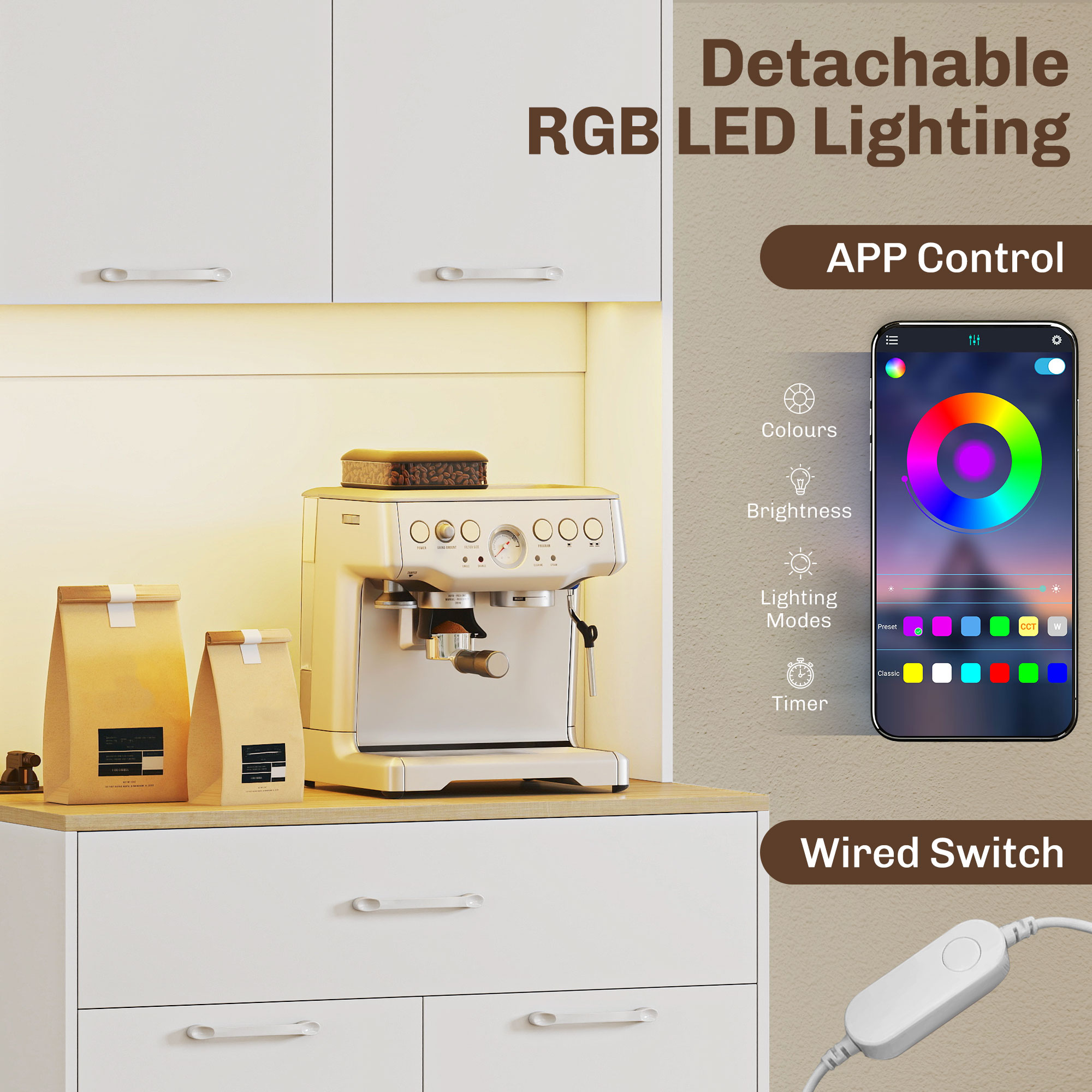 Vrei un spatiu mereu ordonat si functional? Aceasta credenta moderna [BRAND NAME] este ideala ca mobil de bucatarie sau pentru sala de mese. Cu un blat de lucru practic, doua dulapuri cu rafturi ajustabile si un sertar spatios, vei avea totul organizat. Dulapul de bucatarie include o statie de incarcare cu prize de curent si USB pentru electrocasnice mici, in plus fata de o banda LED RGB detasabila care creeaza o atmosfera moderna si primitoare.