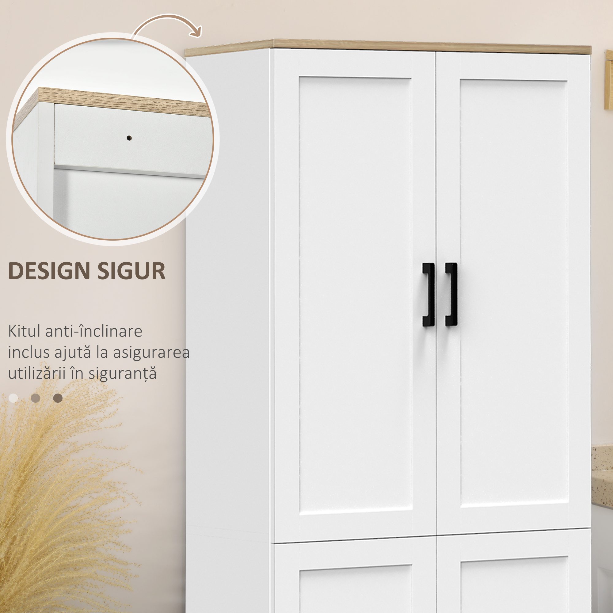 Un corp vertical cu spatiu generos de depozitare: cinci rafturi interioare ajustabile si patru usi pentru organizarea veseliilor, ingredientelor sau ustensilelor. Finisajul alb face dulapul ideal pentru bucatarii moderne si spatii luminoase. Compartimentarea poate fi adaptata vizual si functional: condimente, provizii, cutii, vase. Perfect pentru bucatarii compacte ce necesita stocare ordonata si acces facil.