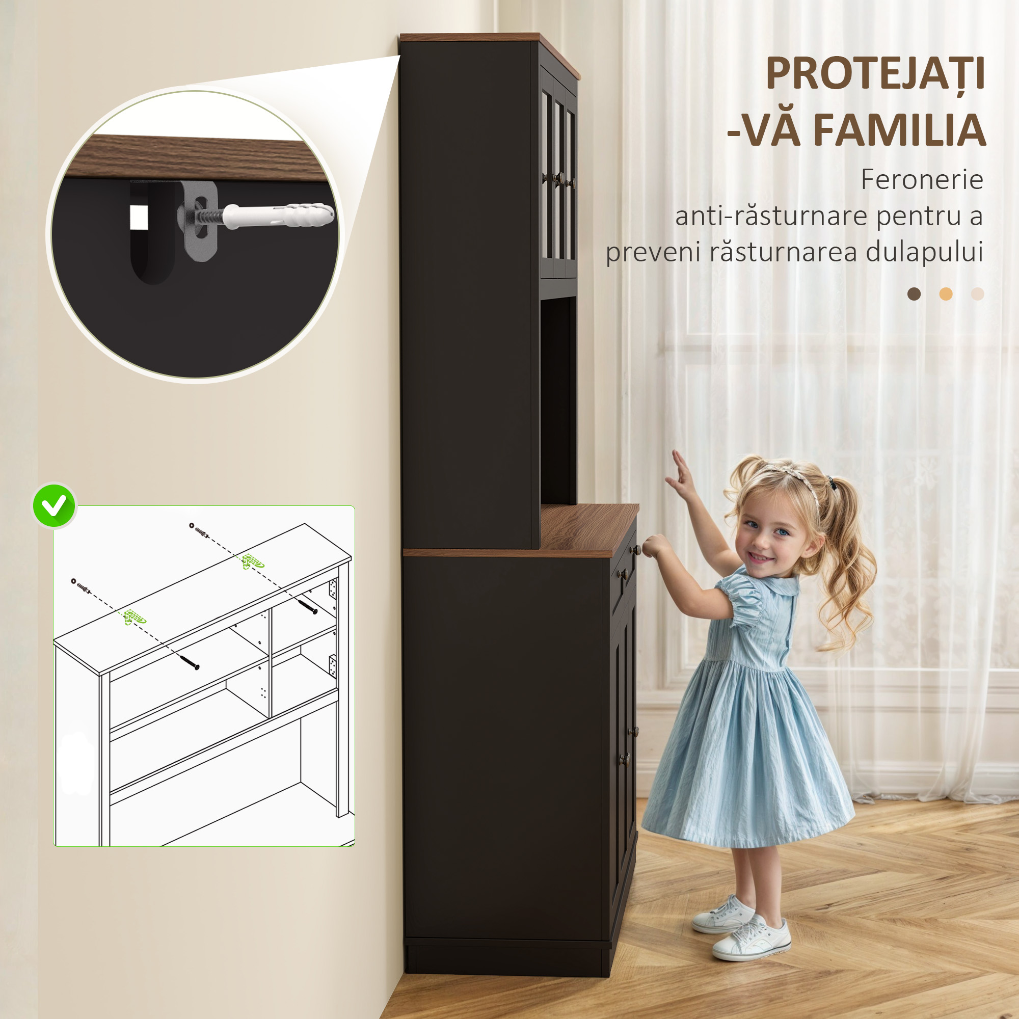 - • Designul anti-rasturnare creste siguranta prin fixarea mobilierului la perete