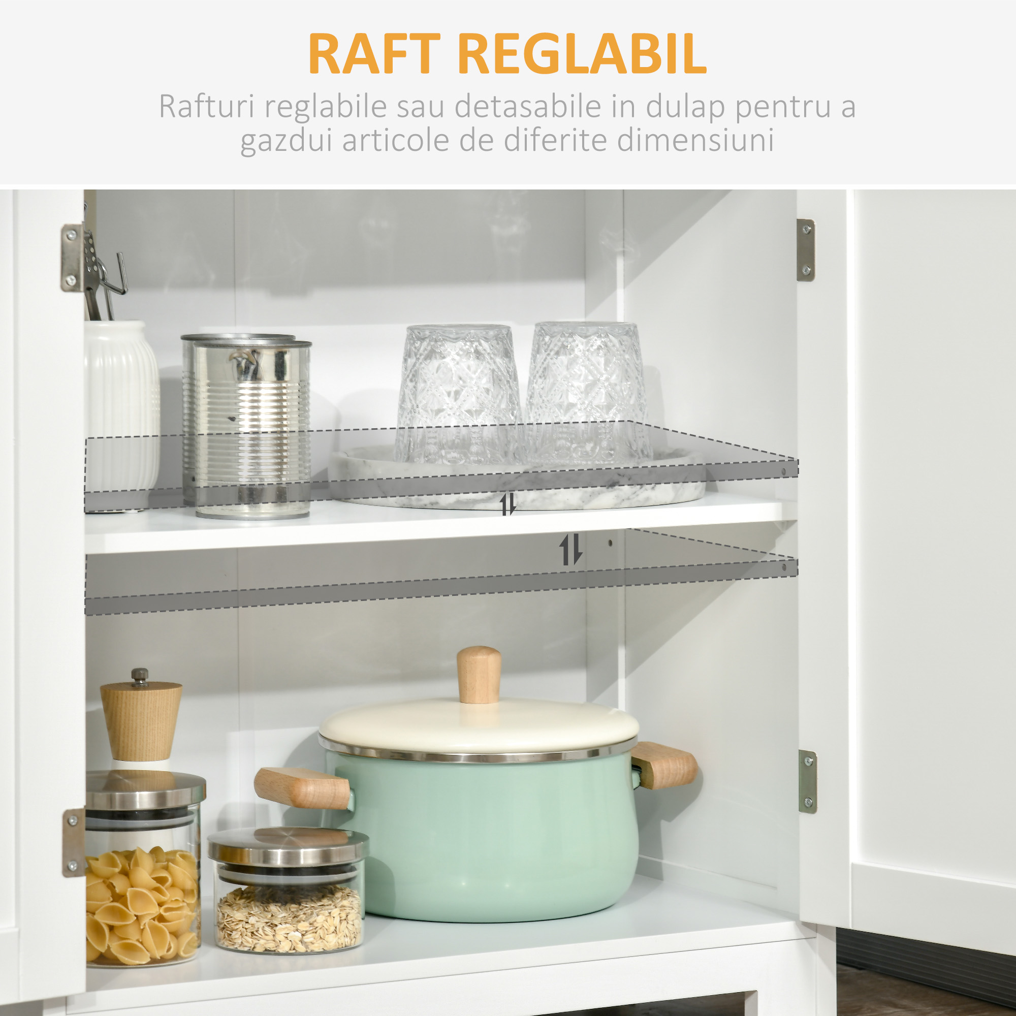 Organizeaza-ti proviziile si accesoriile de bucatarie cu dulapul camara [BRAND NAME], proiectat cu 2 rafturi deschise pentru acces rapid si 2 dulapuri cu usi din sticla securizata pentru depozitare eleganta. Construit din MDF durabil, cu un finisaj alb clasic, acest dulap ofera spatiu generos fara a aglomera incaperea. Ideal pentru bucatarii moderne sau traditionale, adauga functionalitate si rafinament intr-un singur corp de mobilier.
