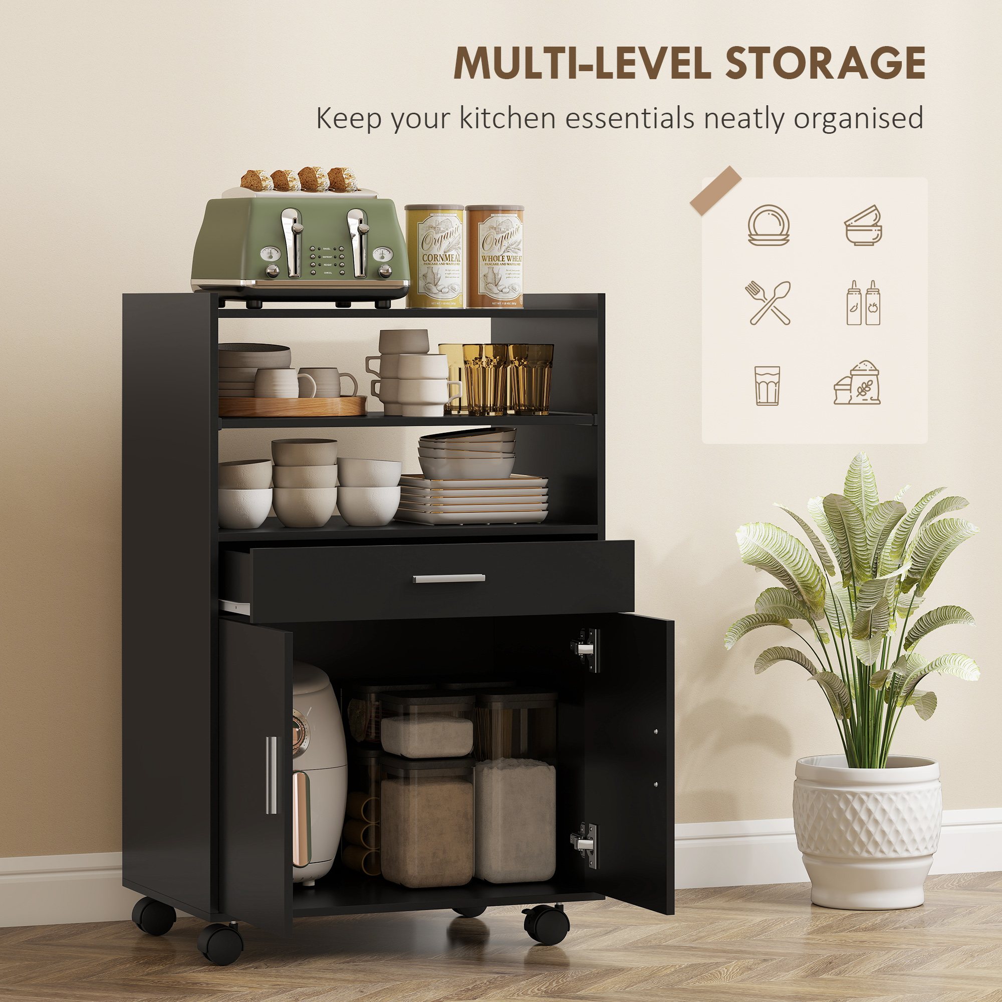 Ai probleme de spatiu in bucatarie? Imagineaza-ti frustrarea unui spatiu limitat si a unui depozitare instabila. Acest dulap pentru cuptorul cu microunde [BRAND NAME] cu blat generos, raft extensibil, sertar si dulap inferior va reusi sa optimizeze la maximum spatiile. Datorita rotilor sale pivotante, il poti muta usor unde preferi. Structura sa solida este capabila sa sustina un cuptor cu microunde si alte aparate mici, asigurand robustete si functionalitate