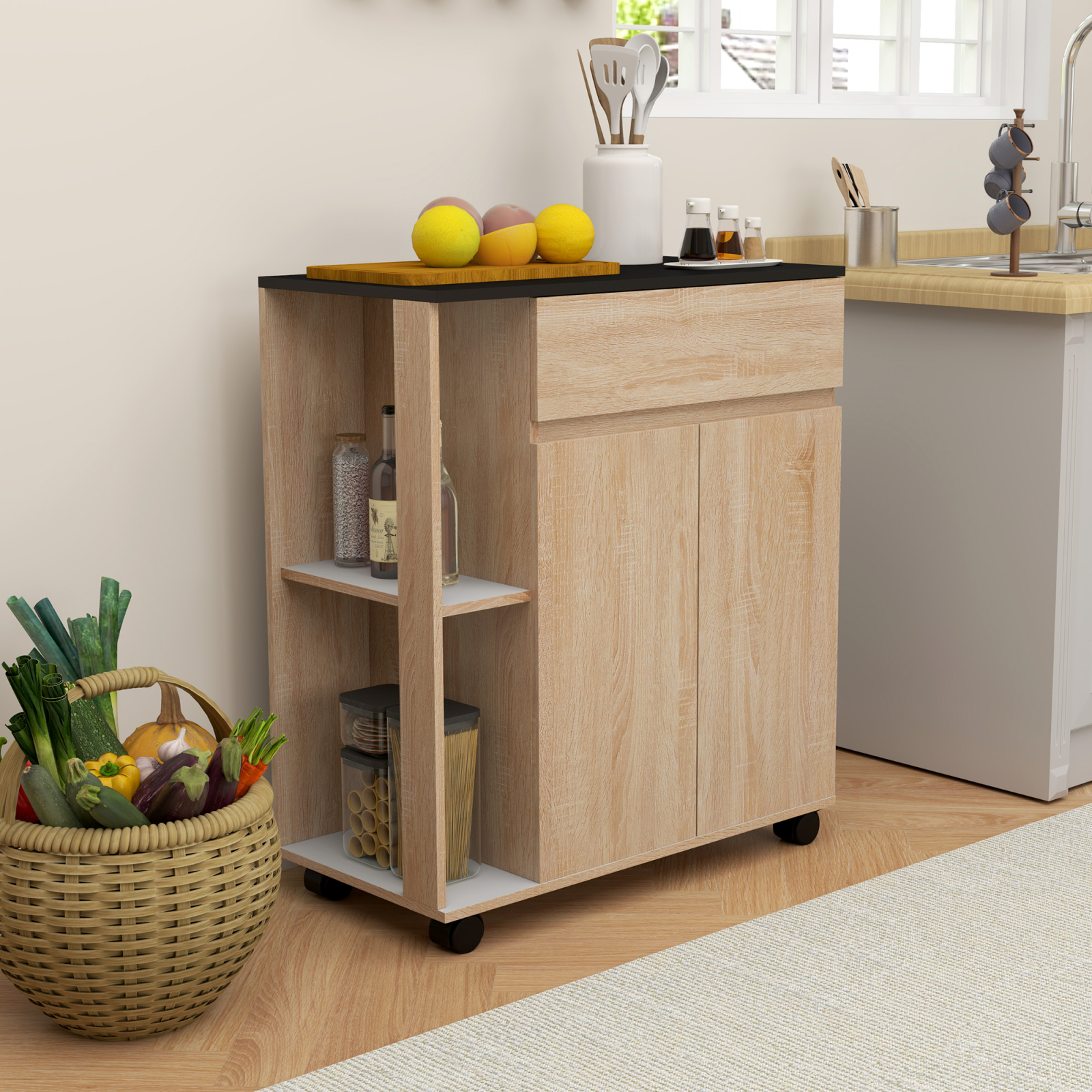 Optimizeaza-ti spatiul in bucatarie cu dulapiorul mobil [BRAND NAME]. Designul elegant in finisaj stejar si negru se potriveste in orice decor modern. Dispune de sertare spatioase si rafturi practice pentru vase, condimente sau ustensile. Rotile pivotante ofera mobilitate completa, iar sistemul de blocare asigura stabilitate. Constructia din PAL de calitate garanteaza durabilitate si intretinere usoara.