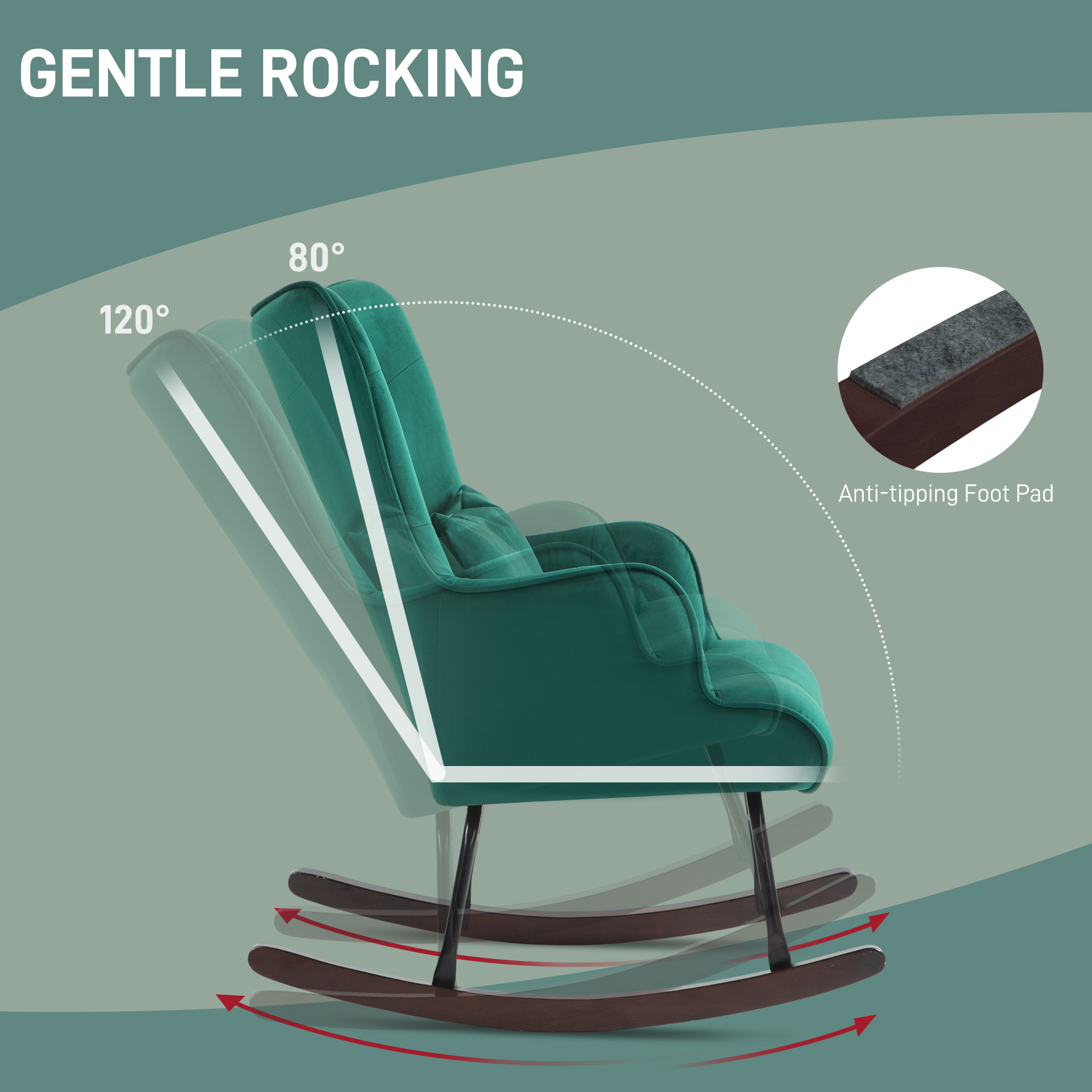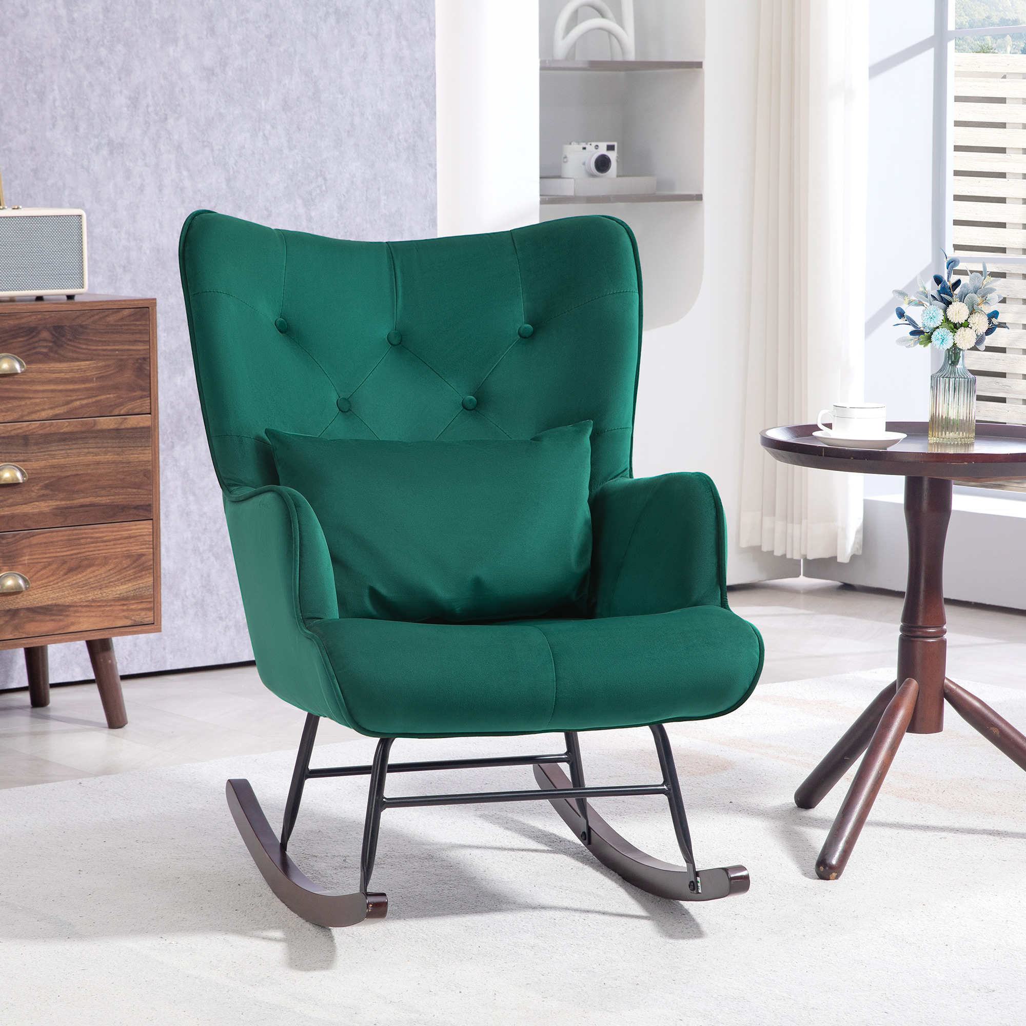 Relaxeaza-te intr-un decor elegant cu fotoliul [BRAND NAME] balansoar din catifea verde, prevazut cu spatar inalt, perna confortabila si brate ergonomice. Dimensiunile de 70x86x94 cm il fac ideal pentru living, dormitor sau camera de lectura. Picioarele curbate din lemn ofera balans lin, iar tapiteria premium aduce lux si confort zilnic.