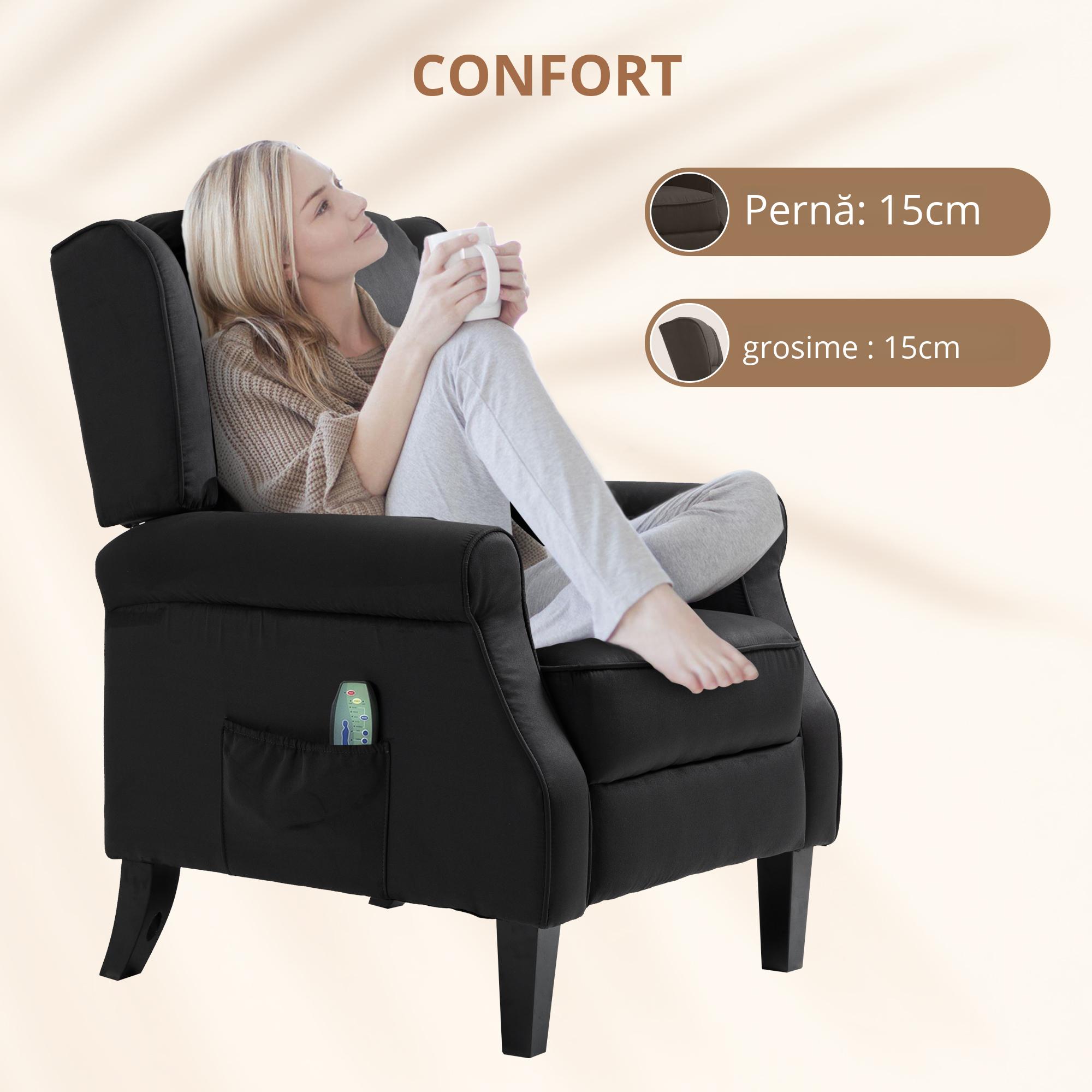 Fotolul nostru cu masaj [BRAND NAME] multifunctional satisface toate exigentele de relaxare dupa o zi lunga de munca. Bucurati-va de un masaj in timp ce va uitati la TV sau cititi o carte. Exista 2 puncte diferite de masaj: unul pe spaar si unul la talie. Datorita functiei de incalzire poate imbunatati efectul benefic al masajului. Spatarul poate fi inclinat manual la 90 sau 150°. Telecomanda inclusa poate fi depoztata in buzunarul lateral al fotoliului.