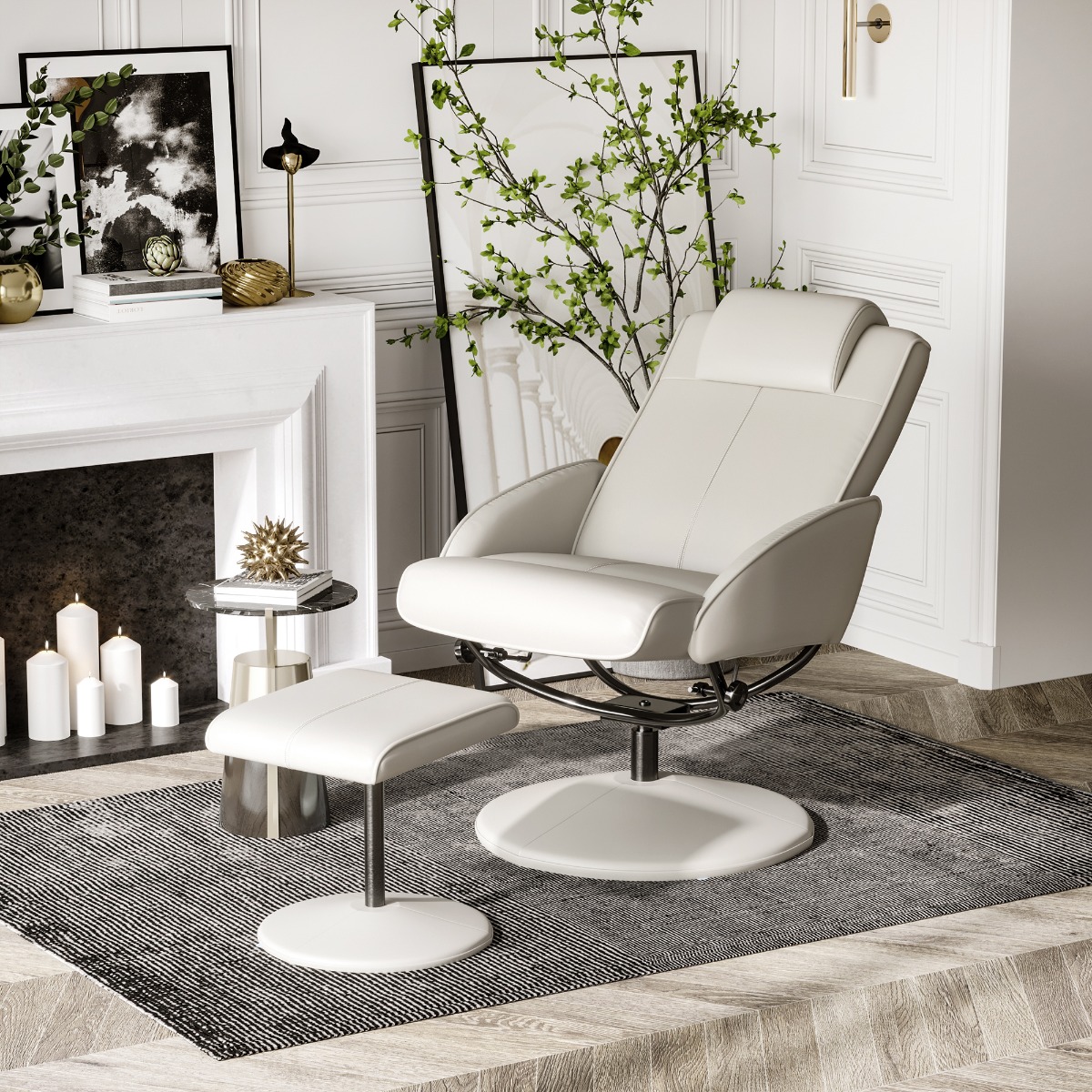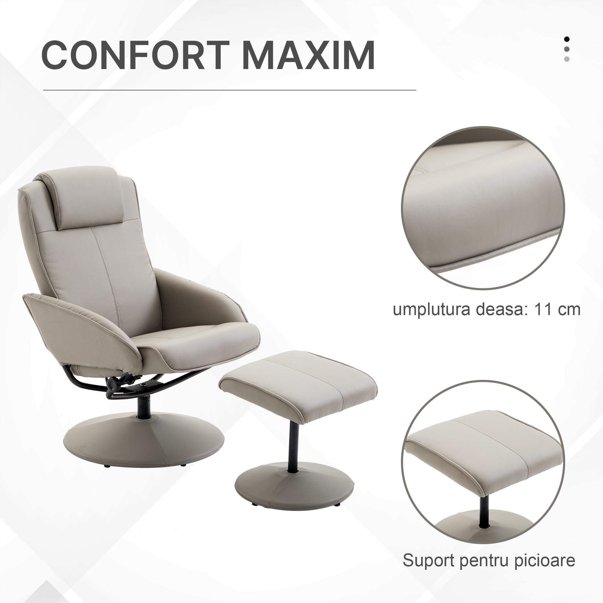 [BRAND NAME] fotoliu cu taburet, din piele sintetica, 98x78x67 cm, gri poate fi o piesa ideala de mobilier care iti completeaza perfect decorul si stilul din orice camera, in timp ce ai si un spatiu perfect de relaxare. Este realizat din materiale de calitate, din piele sintetica, lemn si burete, ce poate fi intretinuta foarte usor. Vine la pachet si cu un suport pentru picioare care iti asigura toate conditiile necesare de confort oricand vrei sa te relaxezi. [BRAND NAME] fotoliu cu taburet, din piele sintetica, 98x78x67 cm, gri se poate inclina pana la 145 de grade pentru a avea o pozitie care nu solicita spatele atat de mult. Timp in care poti intinde picioarele pe taburet. Este un fotoliu atat estetic, cat si functional. Poti opta pentru aceasta varianta chiar si pentru biroul de la munca, fiind confortabil in timp ce lucrezi si fotoliul ideal pentru minutele de pauza cand te poti intinde.