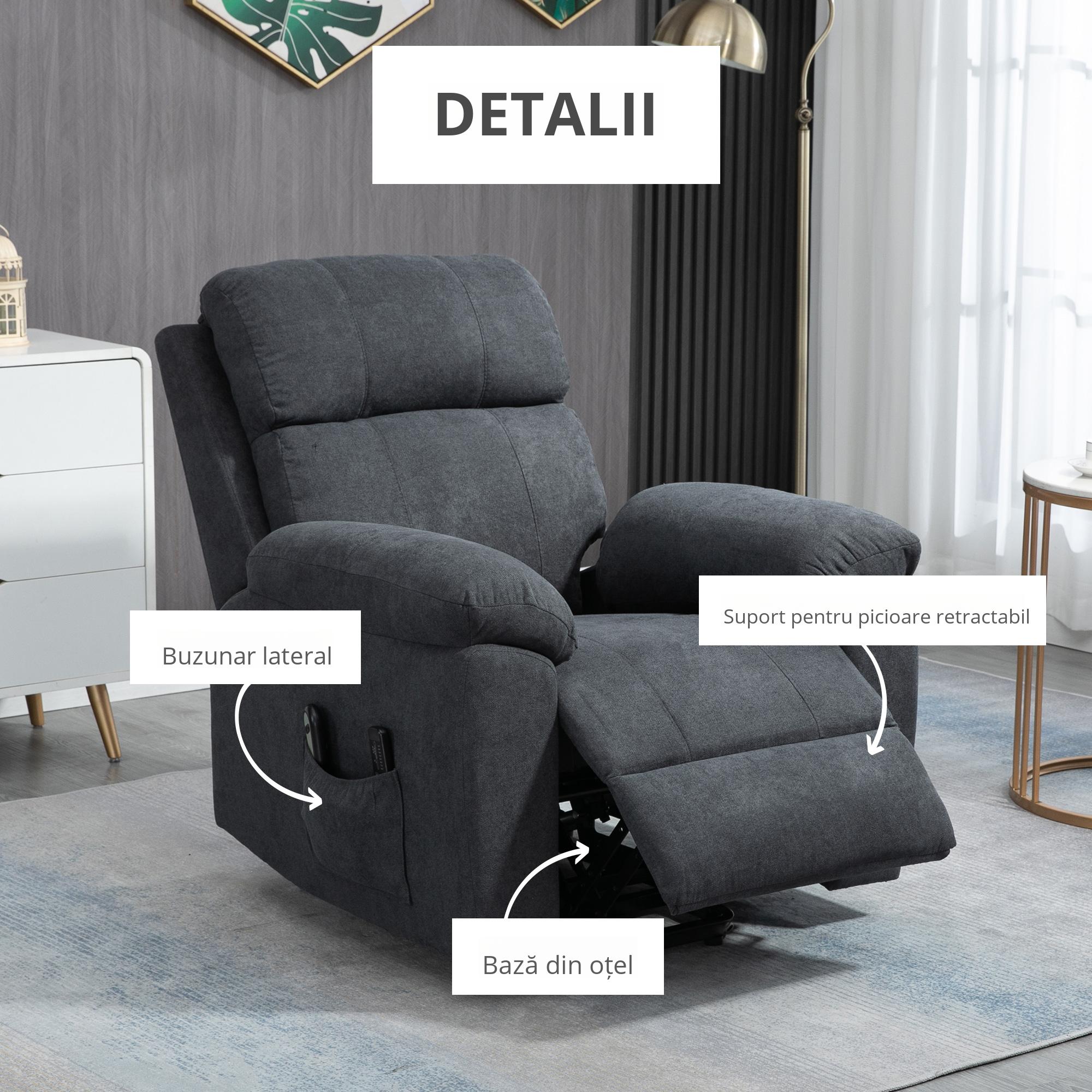 Gandit special pentru persoanele in varsta sau cu mobilitate redusa, scaunul [BRAND NAME] ofera functie de ridicare automata si inclinare lina. Telecomanda inclusa si buzunarele laterale adauga confort si accesibilitate. Tapitat cu material textil placut la atingere, este ideal pentru relaxare in living sau dormitor. Practic si elegant, ofera sustinere si autonomie.