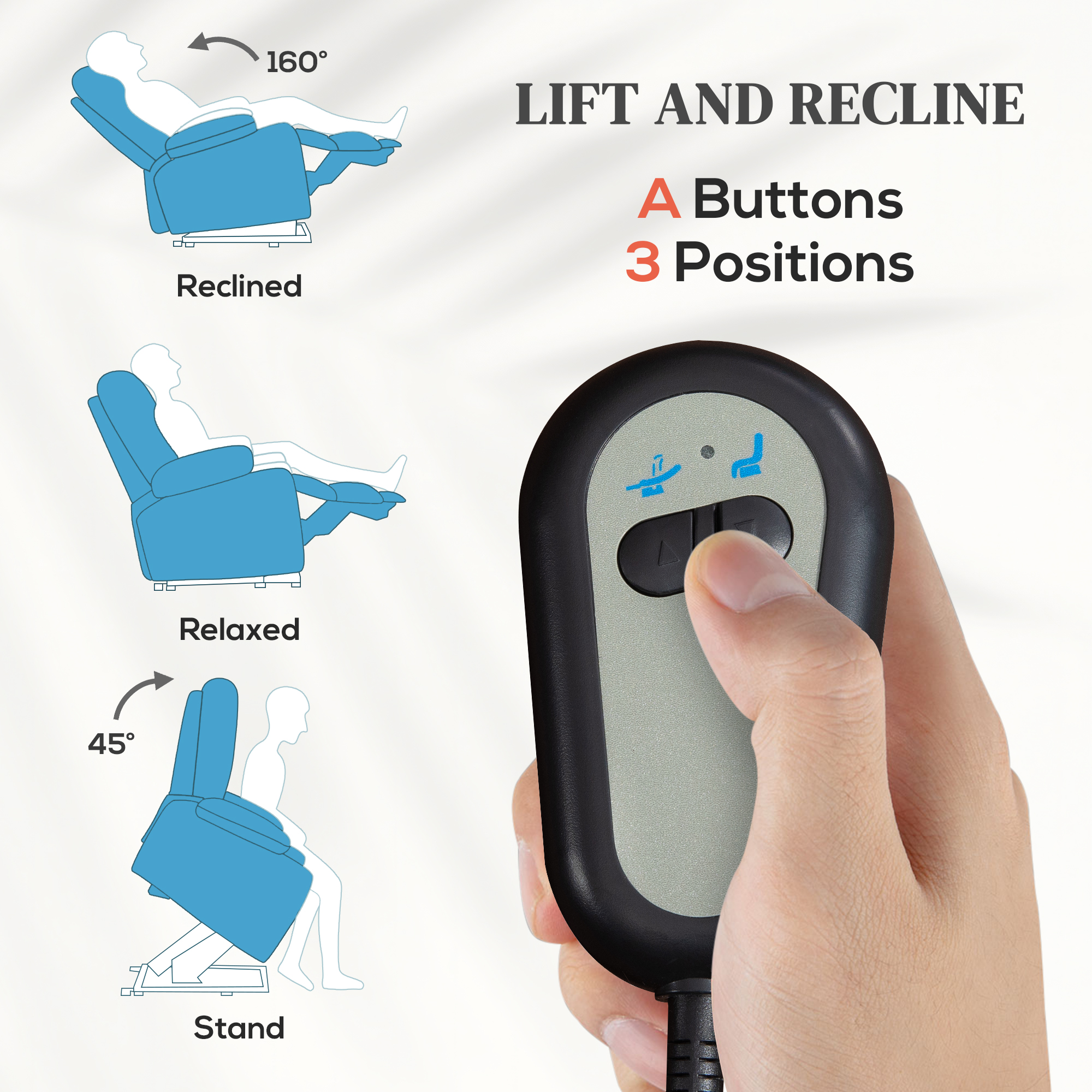 Fotoliul electric [BRAND NAME] ofera relaxare completa datorita mecanismului de rabatare si suportului integrat pentru picioare. Telecomanda permite ajustarea rapida a pozitiilor, iar cele doua buzunare laterale sunt perfecte pentru depozitarea accesoriilor. Materialul textil moale asigura confort chiar si in utilizarea indelungata. Este ideal pentru living, dormitor sau camera seniorilor.
