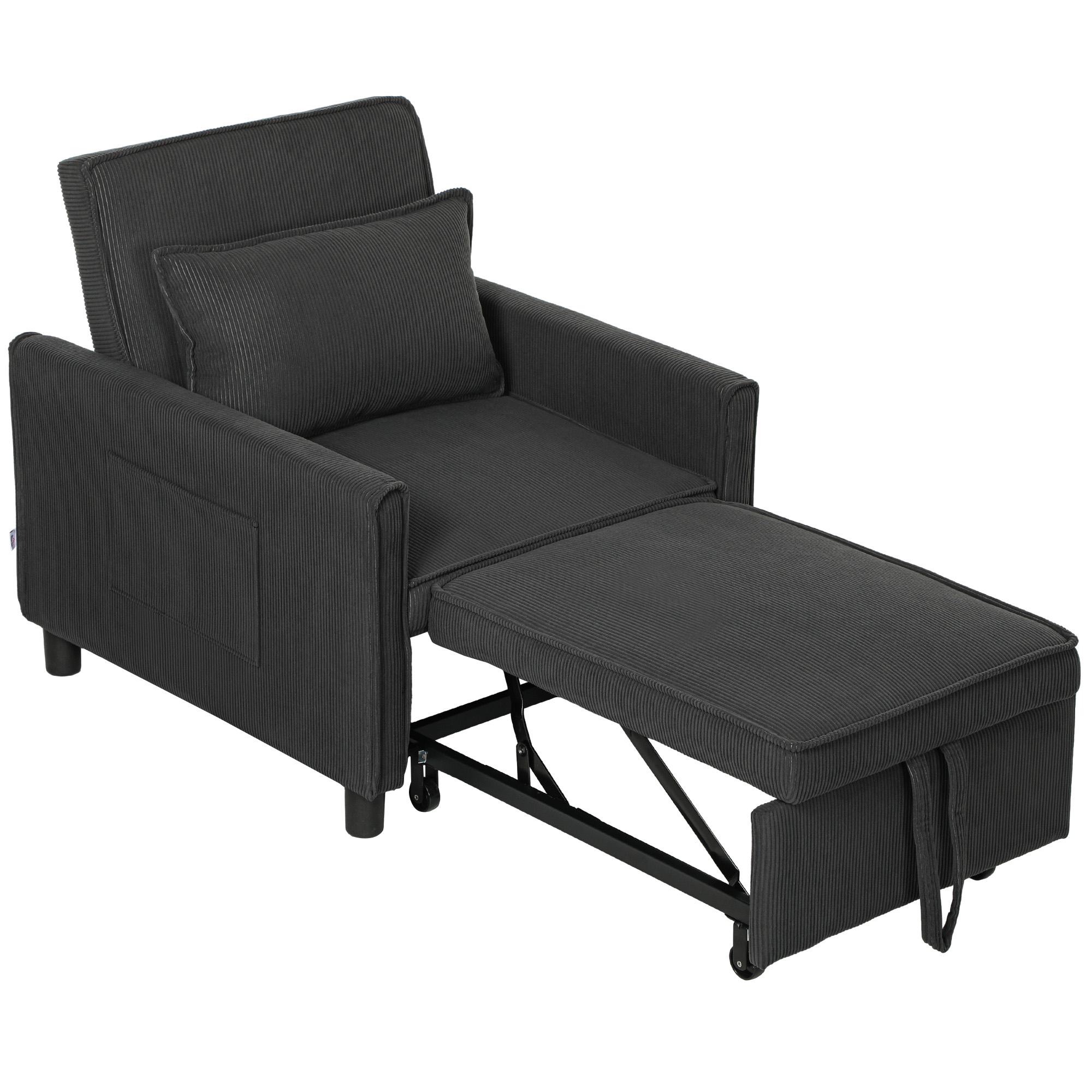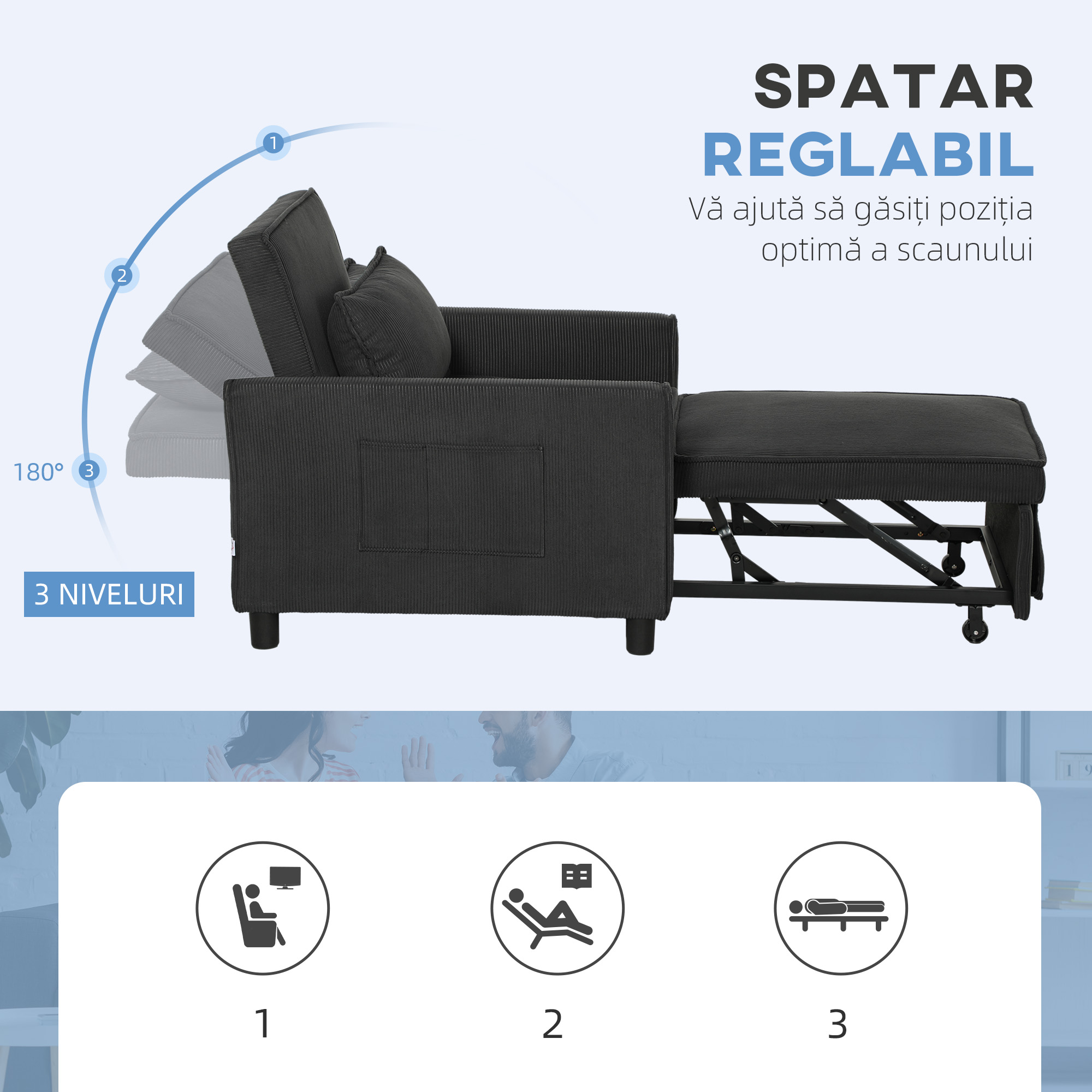 Combina confortul la tine acasa cu un mobilier de stil cu fotoliul-pat [BRAND NAME]. Transforma-l cu usurinta de la fotoliu la pat datorita curelei detasabile incluse si rolelor prezente. Traiesti confortul maxim cu spatarul reglabil pana la 180° si tesatura primitoare de catifea striata, dotata cu umplutura groasa de spuma, perna si arcuri.
