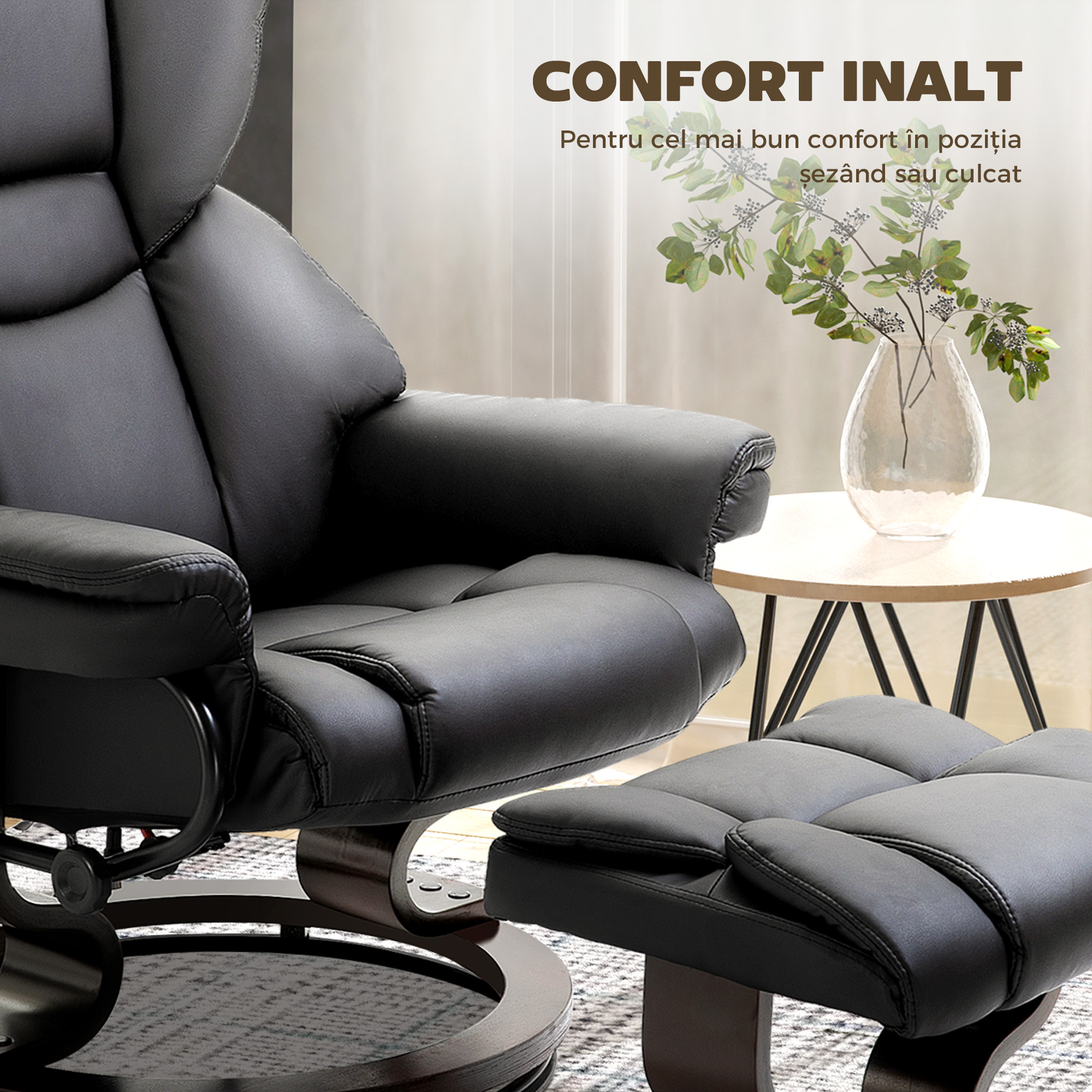 Descopera confortul fotoliului relaxant [BRAND NAME] cu suport pentru picioare, ideal pentru eliminarea stresului in orice moment al zilei. Cu zece puncte de masaj, scaun rotativ la 360° si inclinare pana la 145°, ofera o relaxare completa in timp ce te uiti la TV, citesti sau te odihnesti. Scaunul, spatarul, bratele si suportul pentru picioare sunt moi datorita umpluturii din spuma si acoperirea in piele artificiala eleganta face fotoliul cu suport pentru picioare confortabil.