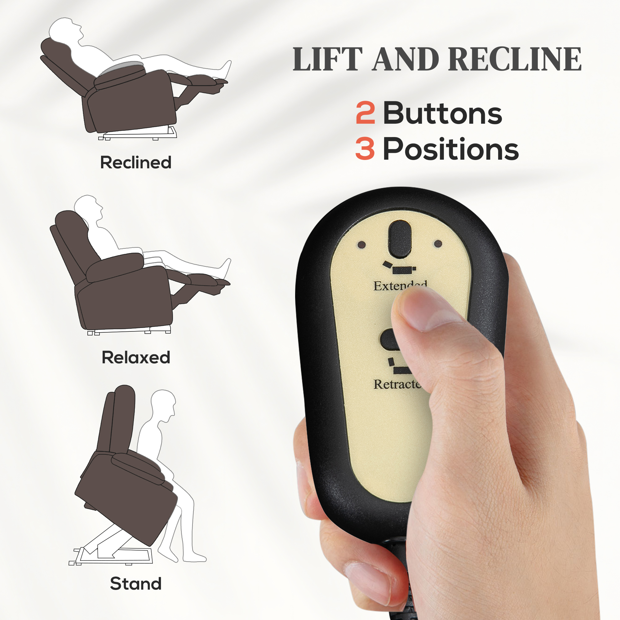 Descopera confortul suprem cu fotoliul electric [BRAND NAME], dotat cu functie de ridicare, masaj prin vibratii si incalzire lombara. Telecomanda permite reglarea usoara a pozitiei si intensitatii masajului, oferind relaxare totala. Tapiteria moale si suportul pentru picioare asigura o postura ergonomica. Ideal pentru seniori sau pentru momentele de relaxare acasa.