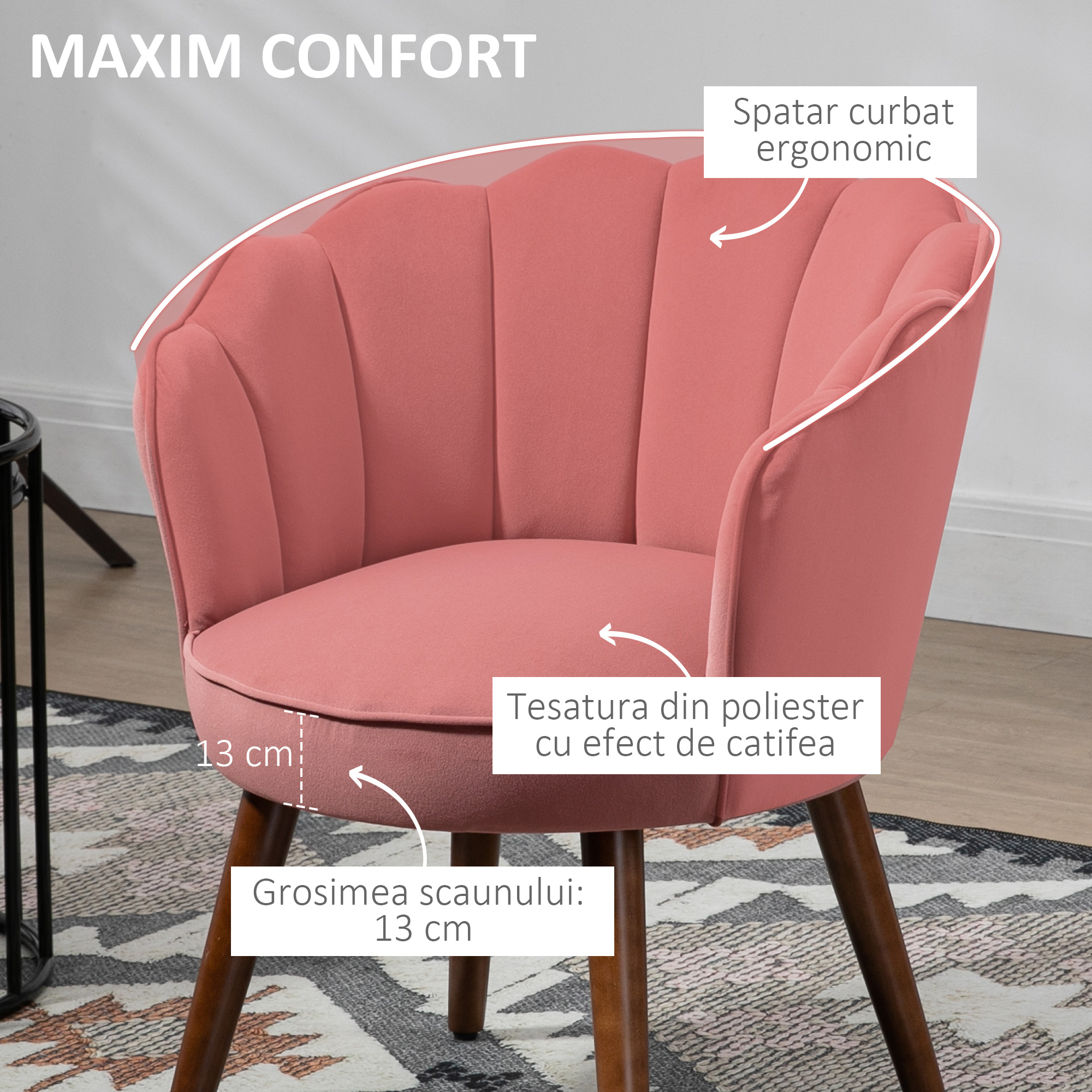 Un fotoliu elegant si confortabil, cu spatar in forma de scoica care ofera suport lombar natural si o experienta relaxanta. Tapiteria roz moale, combinata cu picioarele din lemn stabil, creeaza o piesa de mobilier RAFINATa, ideala pentru living, dormitor sau lounge. Designul ergonomic incurajeaza relaxarea fara a ocupa mult spatiu. Perfect pentru momente de lectura sau conversatie.