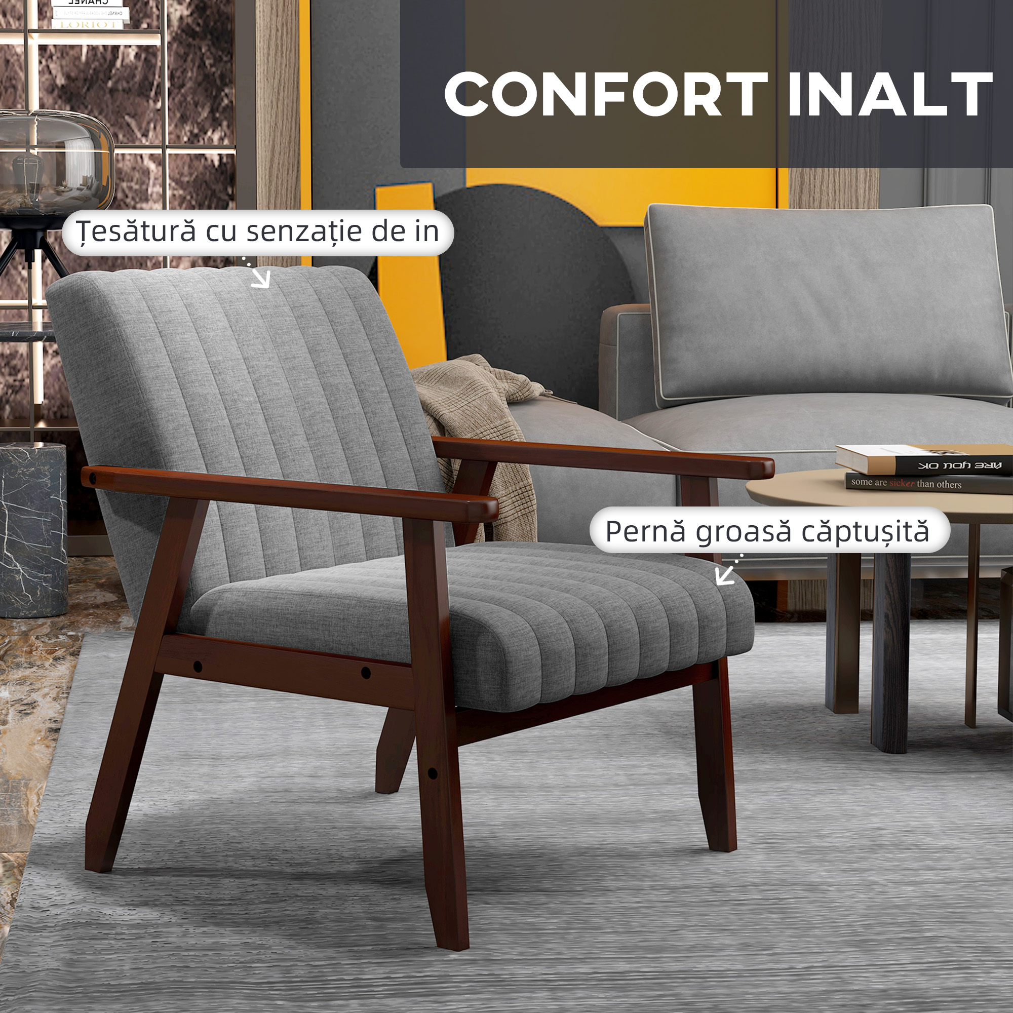 Scaunul modern de ocazie face colturile confortabile o realitate! Un taburet de la [BRAND NAME] poate fi asezat intr-un colt sau sub o fereastra pentru a crea un coltisor confortabil pentru citit sau o zona de conversatie delicata. Scaunele pentru semineu pot fi incluse in holuri sau alte locuri mai putin conventionale, oriunde doriti... Suprafata din material cu aspect de in, sezutul capitonat si spatarul inclinat ofera confort optim, cu picioare maro si tapisare in forma de canal pentru a face din acesta un accesoriu superb si indraznet pe care il veti iubi in casa dvs.
