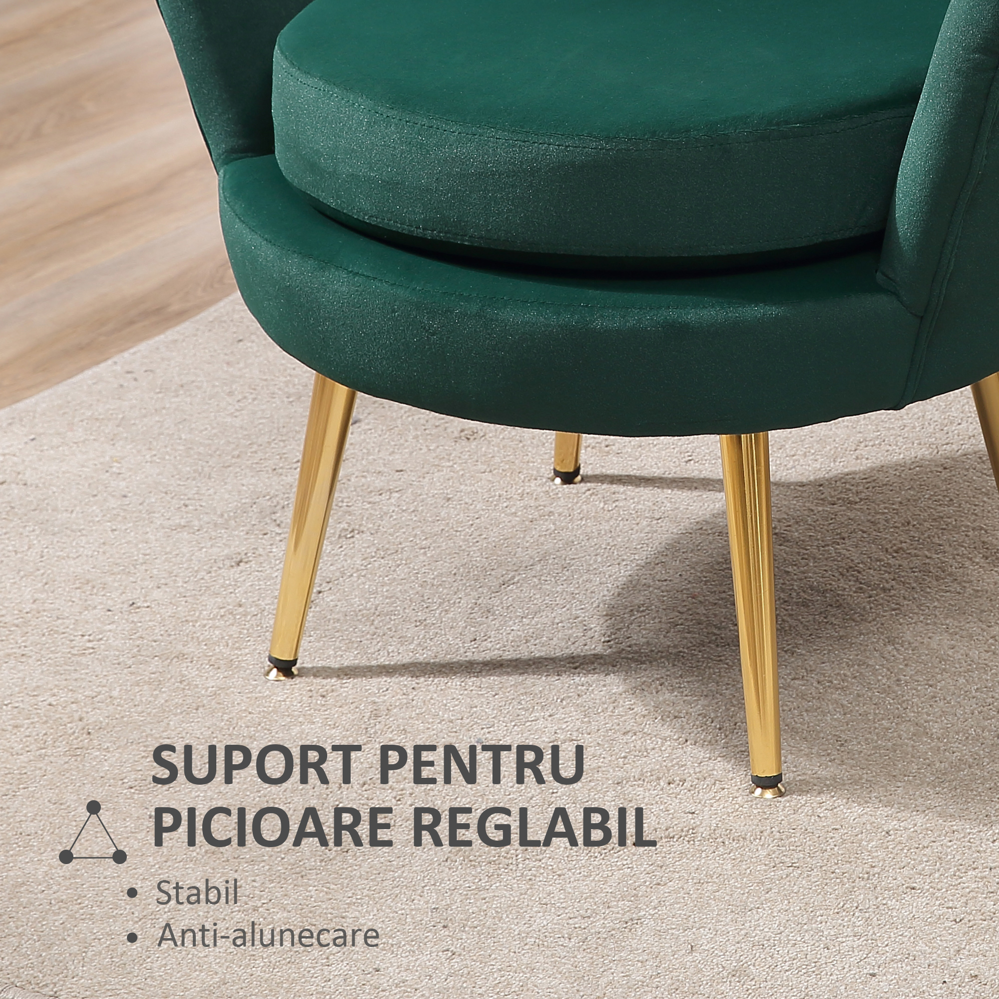 Adauga o nota sofisticata dormitorului sau livingului cu fotoliul [BRAND NAME], tapitat in catifea verde moale. Designul vintage cu linii elegante si spatar ergonomic ofera confort si un aspect de lux. Cadrul robust garanteaza stabilitate si durabilitate pe termen lung. Ideal pentru citit, relaxare sau completarea decorului, fotoliul devine o piesa centrala in orice incapere. Textura catifelata si culoarea rafinata aduc un aer chic, potrivit atat pentru interioare moderne, cat si clasice.