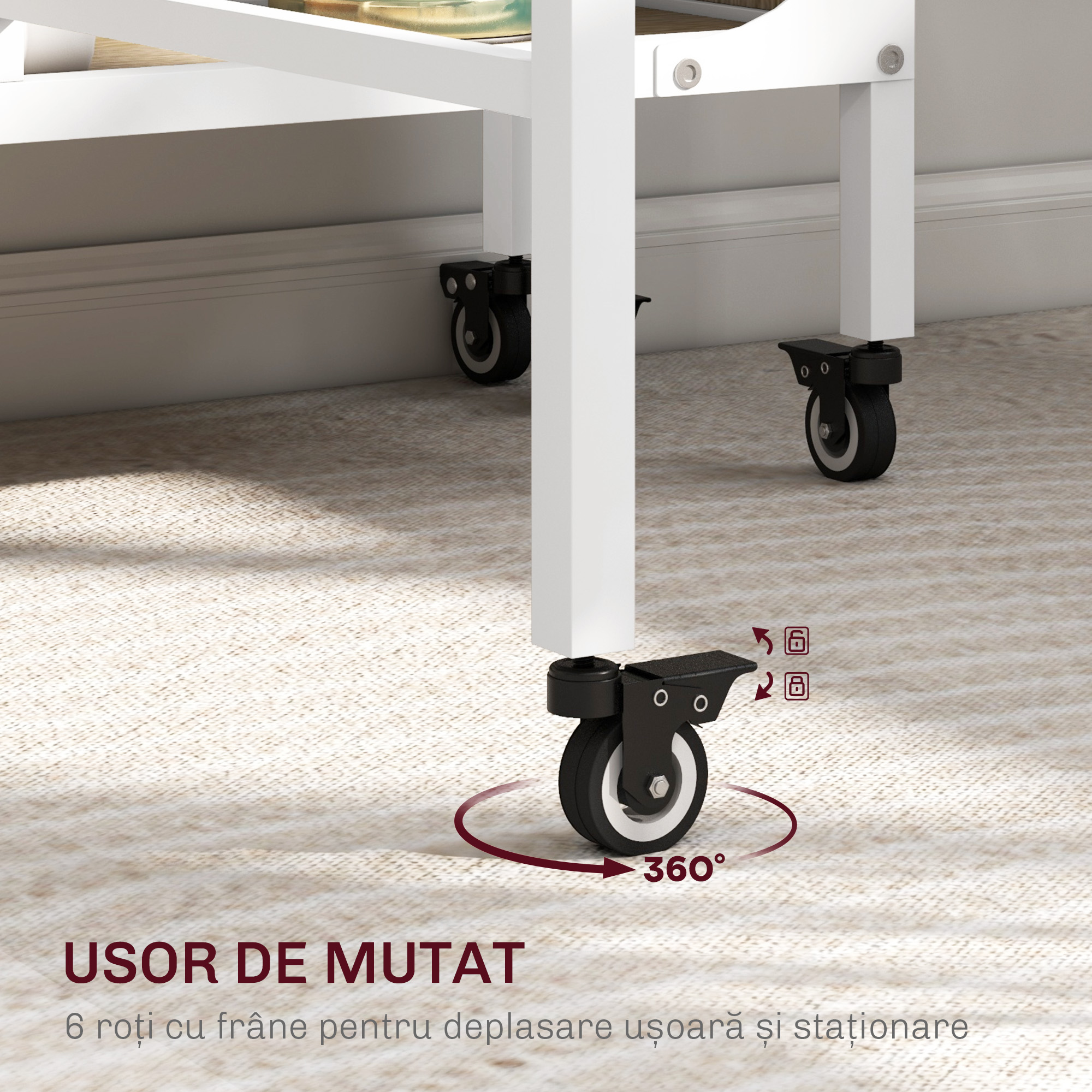 Asigura-ti aceasta masa de dining pliabila de la [BRAND NAME] pentru a economisi spatiu atunci cand ai nevoie si nu-ti mai face griji cu privire la dimensiuni. Realizata cu un design extensibil, in care ambele parti laterale se pot ridica, structura creeaza o suprafata suplimentara si se pliaza inapoi intr-o unitate compacta fara probleme. Masa este dotata si cu un raft de depozitare central pentru a depozita obiecte de diferite dimensiuni si are 6 rotile pentru a o muta cu usurinta.