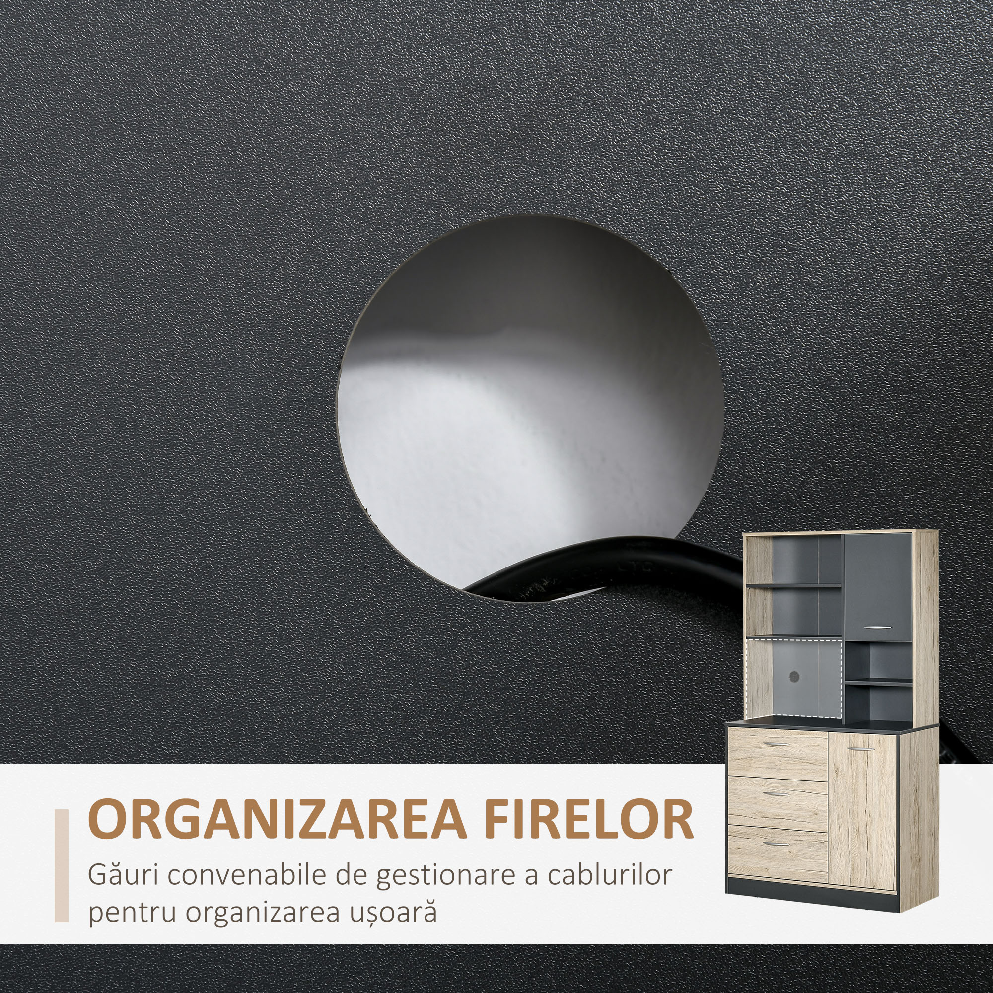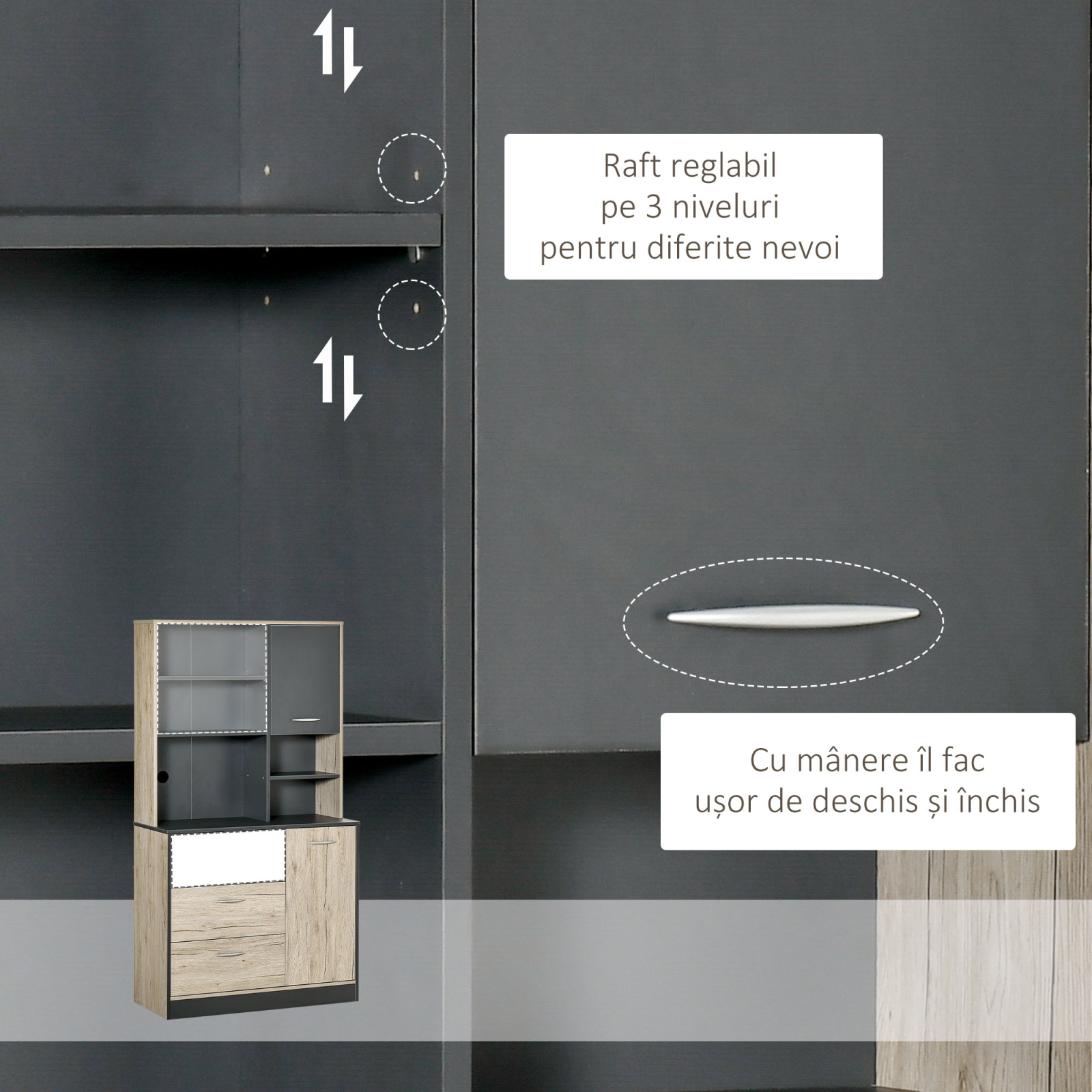 Adaugati eleganta functionala in bucatarie cu acest corp [BRAND NAME] robust, in tonuri stejar si negru. Dispune de patru rafturi spatioase pentru vase, vase decorative sau condimente. Raftul superior adaugat ofera versatilitate de depozitare, iar finisajul modern confera o atmosfera industriala chic. Ideal pentru bucatarii contemporane, il puteti folosi ca spatiu de servire sau "pantry board".