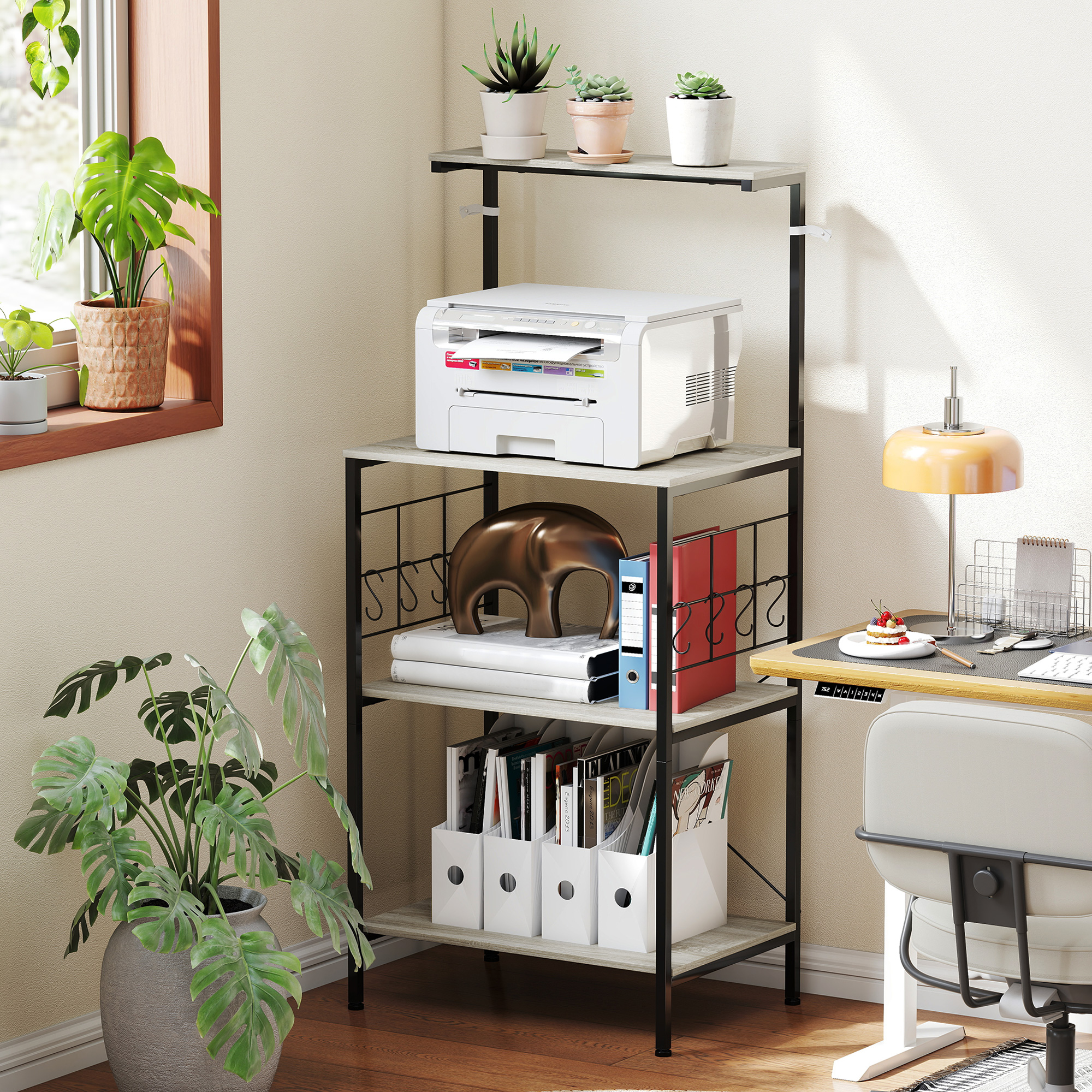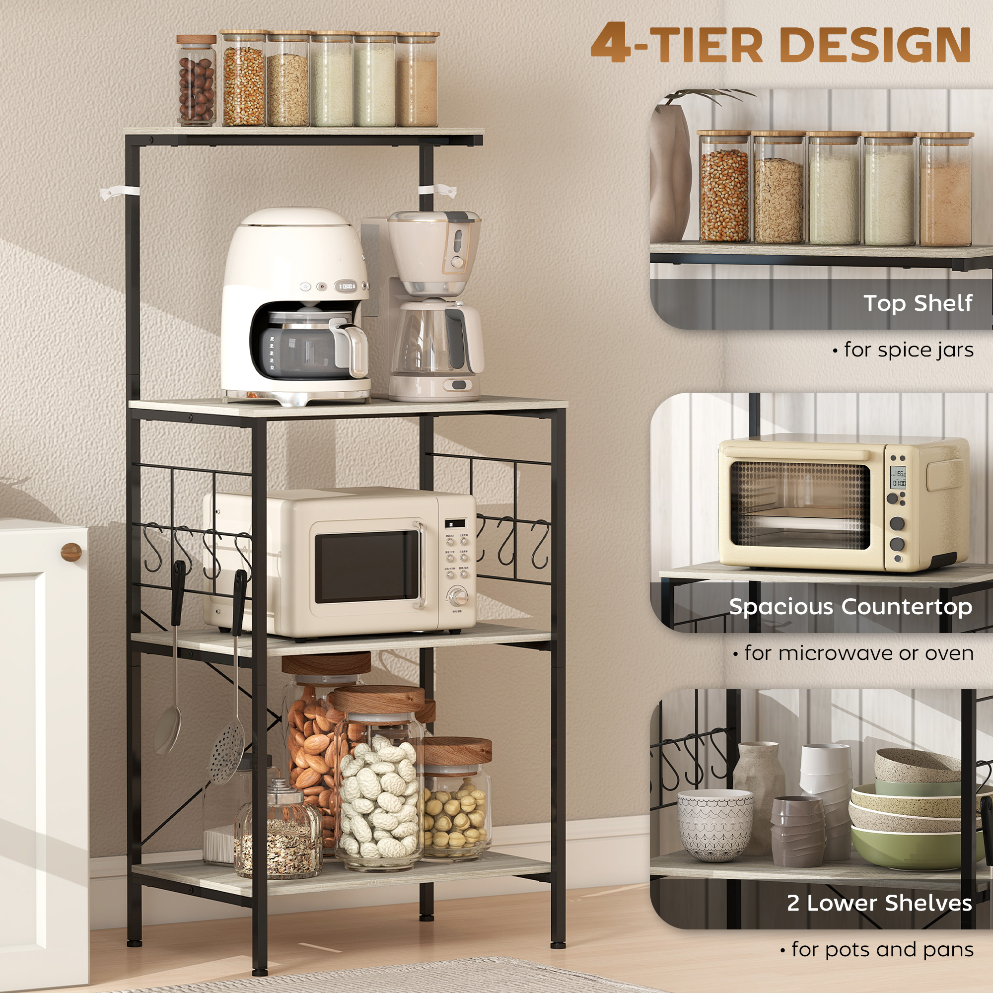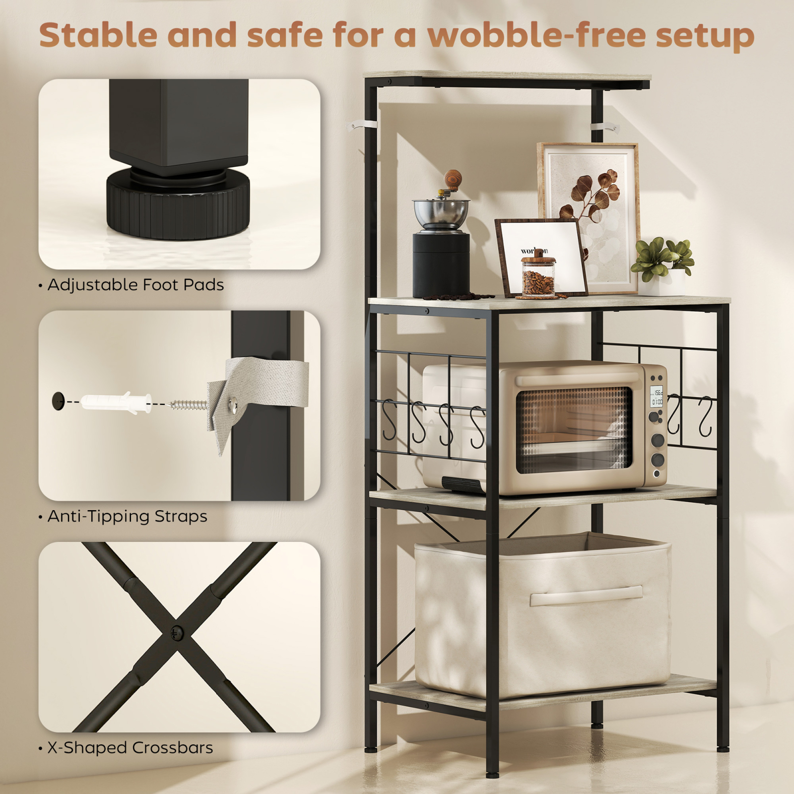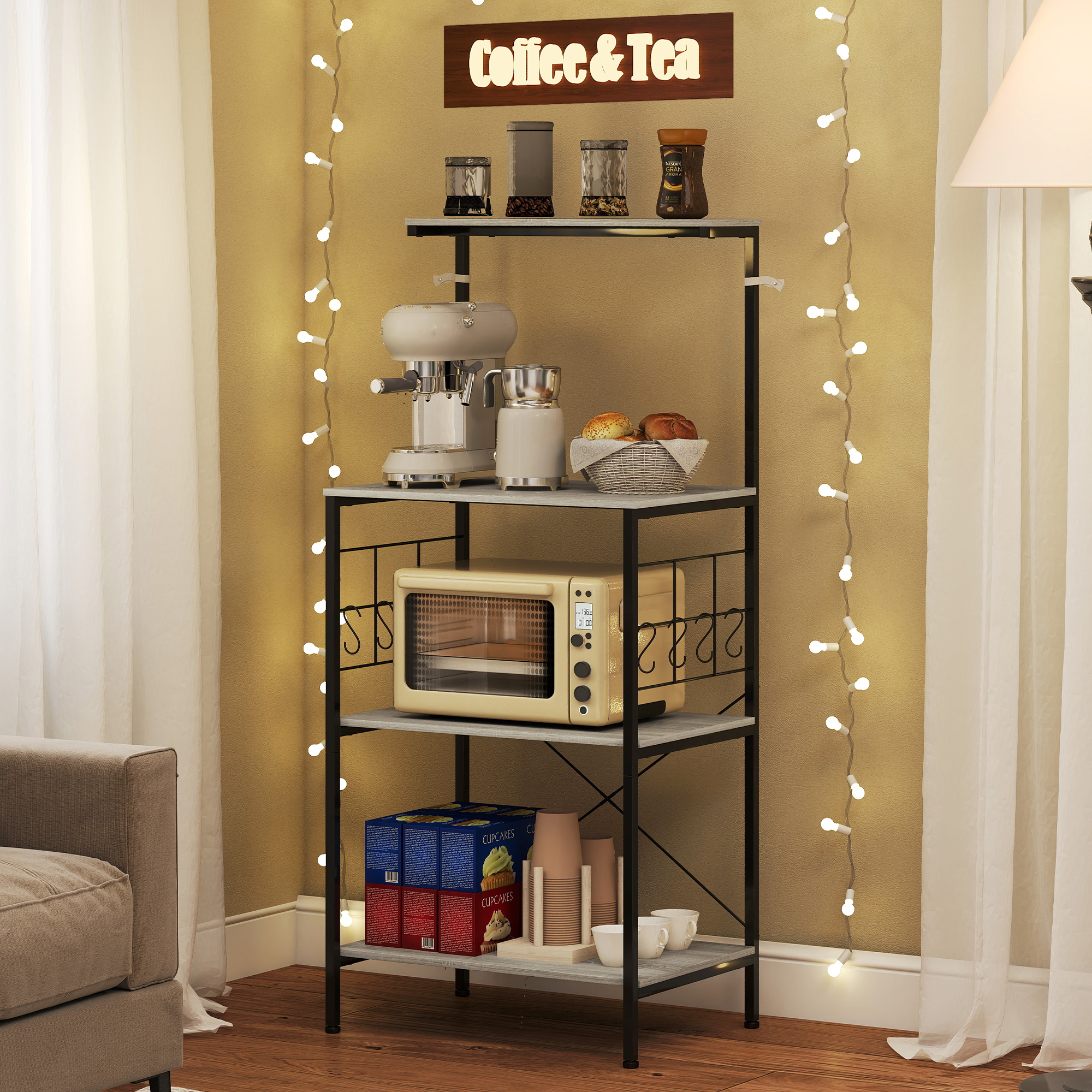 Rezolva problemele tale de spatiu si dezordine in bucatarie cu mobilierul pentru cuptorul cu microunde [BRAND NAME]. Dispune de un blat de lucru mare, un raft superior si doua inferioare, ideale pentru aparate mici si vase. Grilajele laterale cu 8 carlige S permit agatarea cestilor sau ustensilelor, pastrand totul la indemana. Cu finisaje din stejar si cadru negru in stil industrial, acest mobilier pentru bucatarie se integreaza in orice decor.