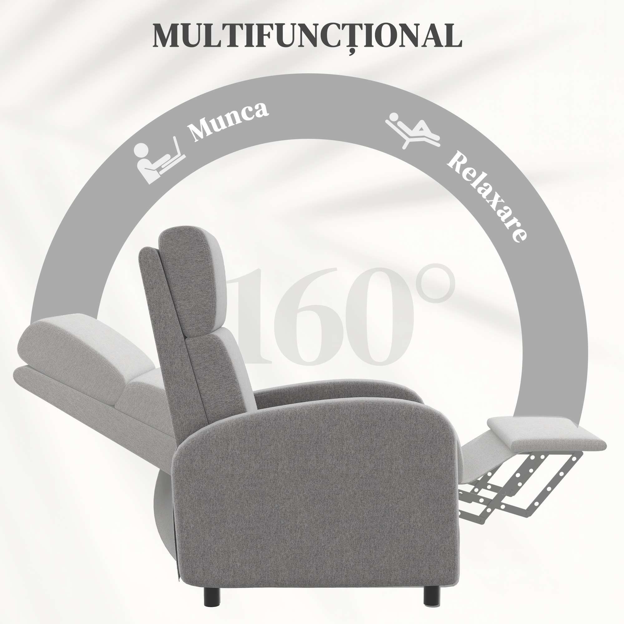 Petreceti-va timpul liber pe aceasta canapea inclinabila [BRAND NAME]. Cu un unghi de inclinare de 160 de grade, perne groase si o suprafata din tesatura asemanatoare cu cea a panzei, aceasta canapea inclinabila [BRAND NAME] va ofera un loc minunat pentru a va relaxa. Puteti sa o amplasati in camera de zi, in dormitor sau in birou si nu trebuie sa va faceti griji cu privire la electricitate. Cadrul este robust si stabil. Doar inclinati-va si puneti-va picioarele pe suportul pentru picioare pentru a va bucura de timpul liber.