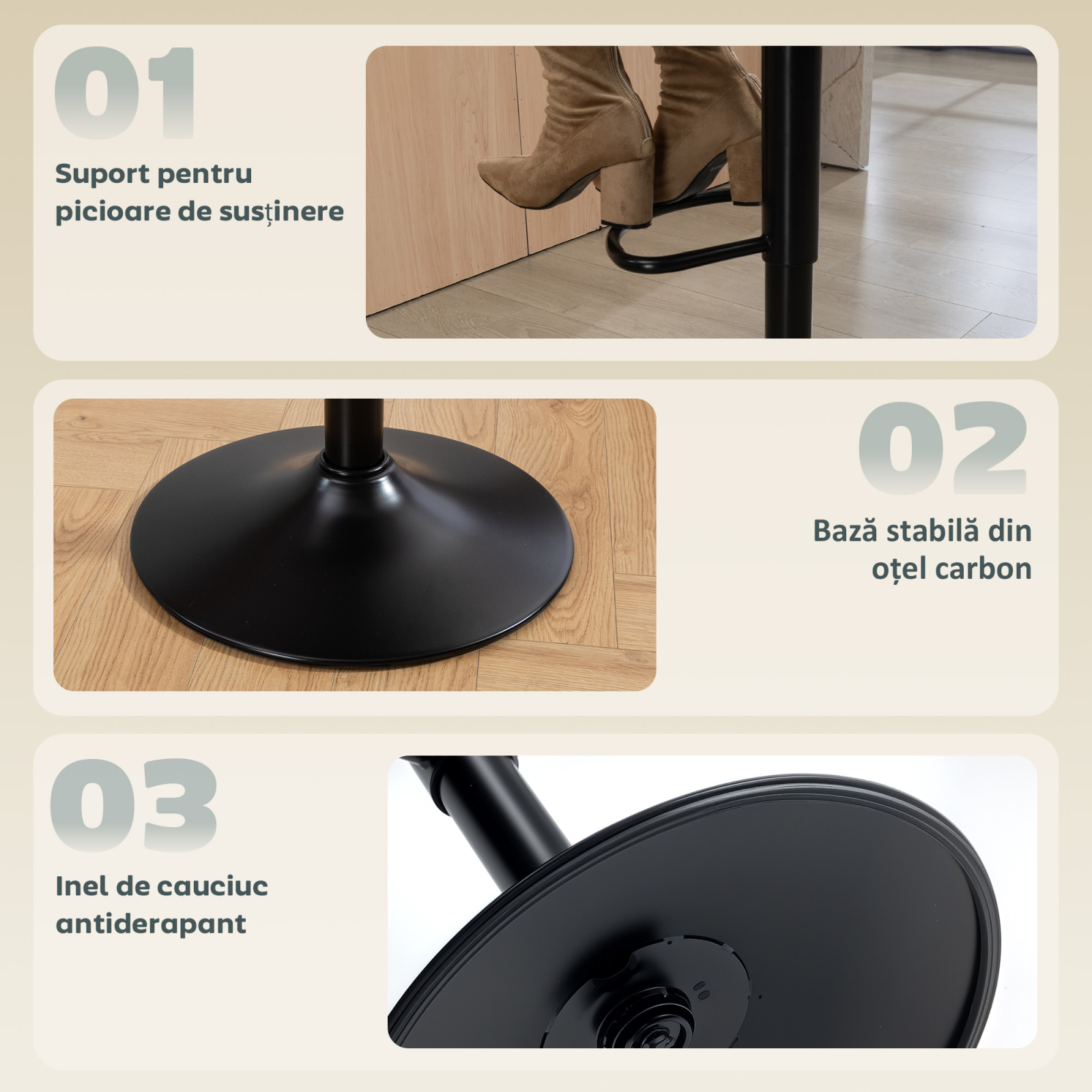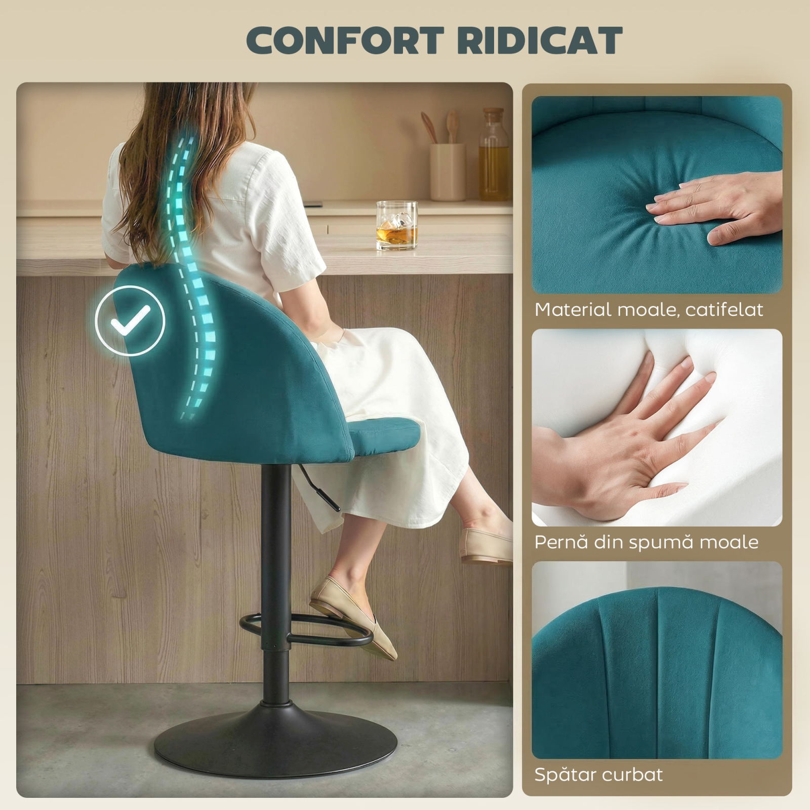 Bucura-te de confortul maxim cu scaunele de bar [BRAND NAME], acoperite cu material textil tip catifea moale si delicat pe piele, cu umplutura din spuma pentru conversatii lungi sau mese in familie. Spatarul curbat al setului de 2 scaune inalte sustine corpul, iar suportul pentru picioare relaxeaza picioarele pentru un confort total. Reglarea inaltimii si rotirea la 360° le fac elegante si practice pentru orice bucatarie.