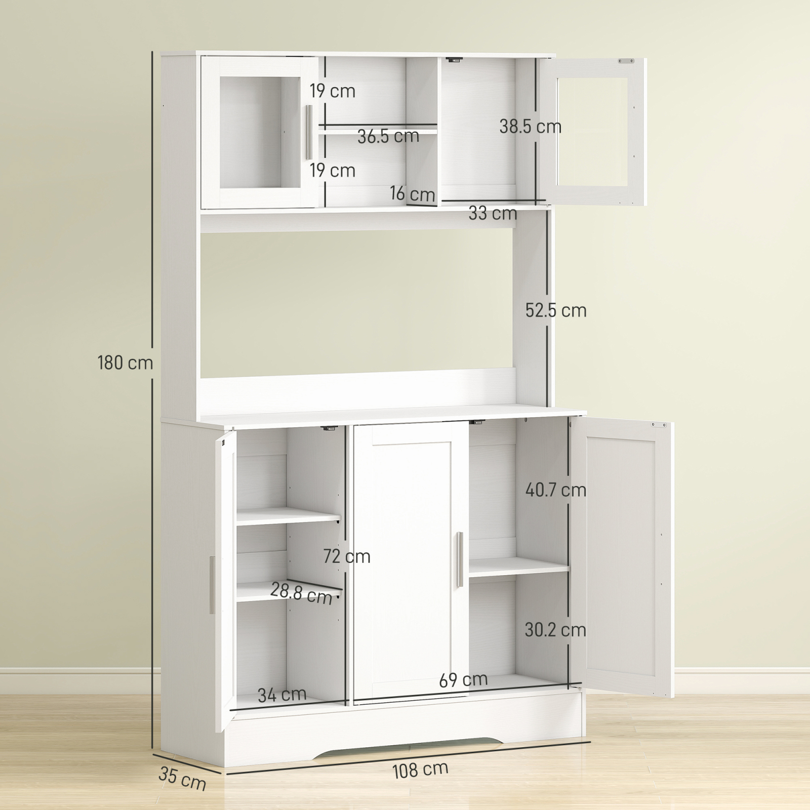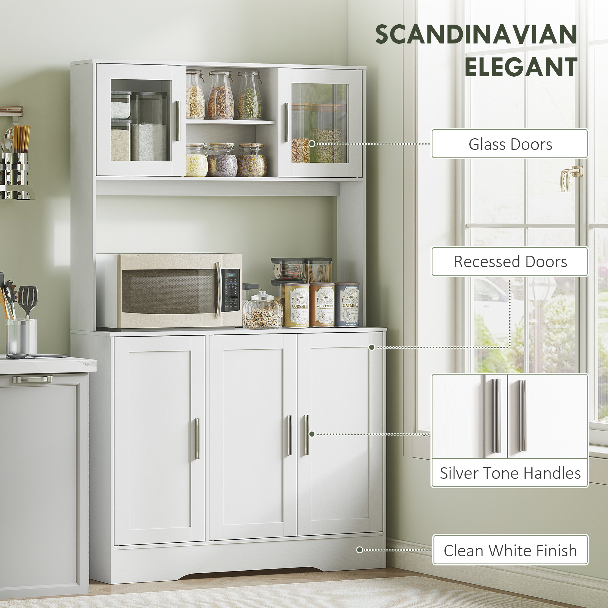 Gaseste spatiu pentru orice cu dulapul nostru dispensa [BRAND NAME]. Structura include 4 dulapuri pentru oale, pahare sau vase, 2 compartimente deschise pentru pozitionarea cestilor sau tacamurilor si o suprafata de lucru generoasa pentru electrocasnice. Rafturile ajustabile si designul scandinav alb cu manere argintii adauga un mix de rafinament si functionalitate in decorul casei tale.