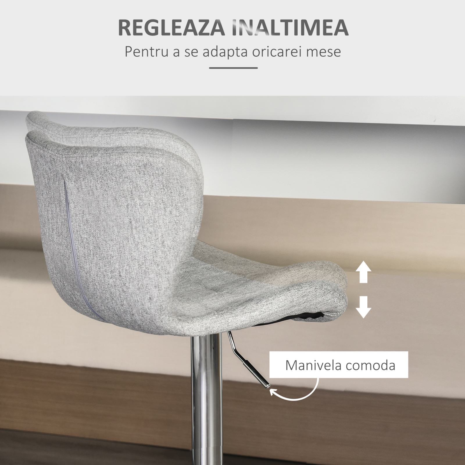 Adauga stil si confort in zona de dining cu produsul nostru rotativ si reglabil pe inaltime. Design modern cu spatar curbat, tetiera pentru picioare si sezut ergonomic, tapitat in stofa gri eleganta. Baza metalica cromata ofera stabilitate, iar mecanismul de reglaj permite adaptarea la orice bar sau insula de bucatarie. Potrivite pentru interioare contemporane sau minimaliste, aceste scaune imbina confortul cu functionalitatea.
