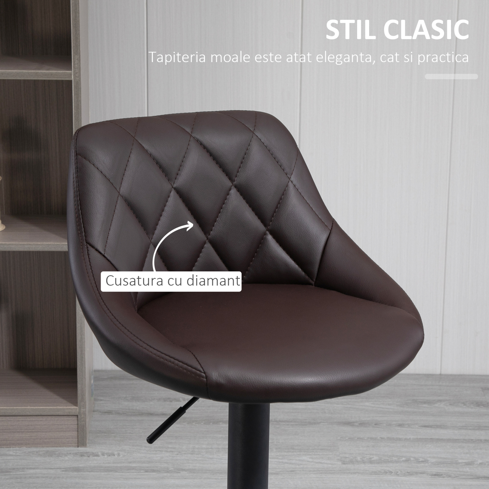La bar, mini bar, in bucatarii sau livinguri amenajate cu blat inalt, [BRAND NAME] set 2 scaune de bar, reglabile, imitatie de piele maro este alegerea potrivita. Acestea sunt practice si concepute sa completeze decorul, contribuind si la designul de interior. [BRAND NAME] set 2 scaune de bar, reglabile, imitatie de piele maro au spatar lat decorat cu cusaturi. Acoperite cu strat gros de material, sunt moi si confortabile. Cadrul lor este stabil si rezistent, metal vopsit negru, cu baza rotunda si suport pentru picioare. Reglati scaunele in functie de inaltimea dorita. in acest sens o simpla apasare pe maneta de sub sezut va ajuta. Ridicare si coborare lina. Suporta pana la 120 de kilograme. Fie ca amenajati cu bun gust o cafenea, un bar sau creati acasa zona de bar, puneti accent pe eleganta detaliilor. Acest set de scaune sunt reprezentative pentru o astfel de preferinta.