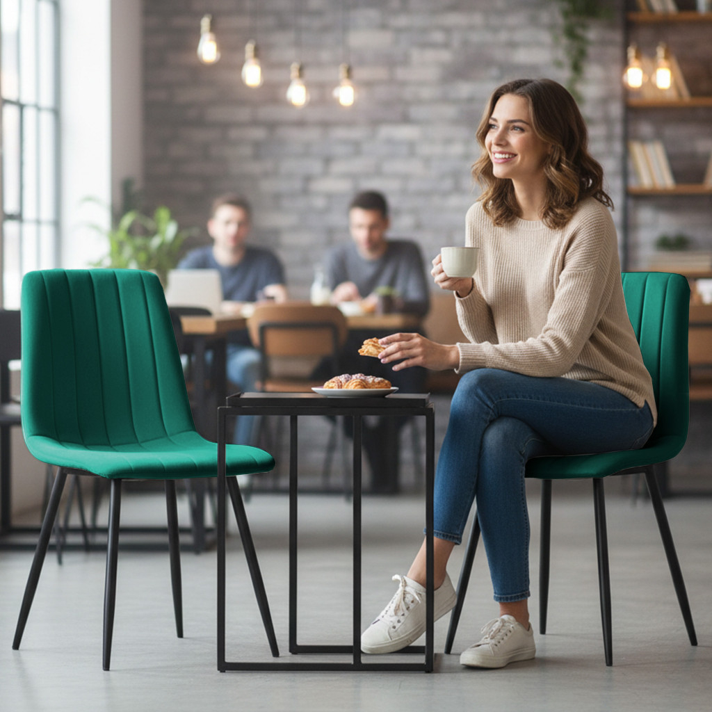 Setul LIVO cu 6 scaune tapitate in velur este o alegere eleganta si practica pentru dining, living sau spatii de birou. Tapiteria moale si spatarul matlasat ofera confort sporit, iar picioarele metalice negre completeaza designul modern. Forma simpla permite integrarea usoara atat in interioare contemporane, cat si clasice.