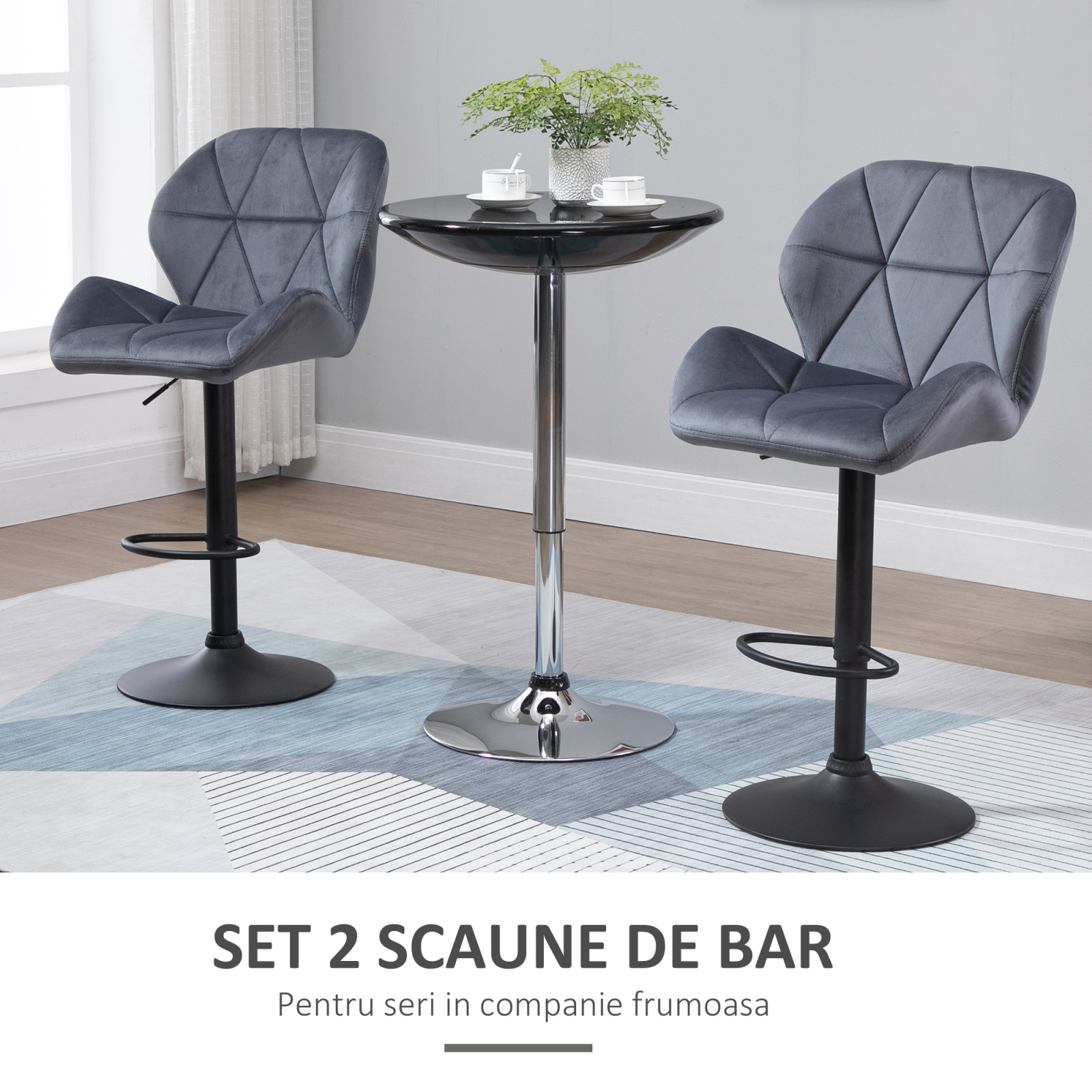 Scaunele de bar [BRAND NAME] set de 2, pivotante si reglabile pe inaltime, va ajuta sa creati un spatiu de divertisment elegant. Aceste scaune cu design cu diamante sunt elegante si confortabile. Tapiteria moale din catifea ofera confort maxim. Ideale pentru bucatarie sau bar, cu un suport antiderapant si picioare pentru stabilitate si protectia podelei, aceste scaune sunt combinatia perfecta de stil si functionalitate pentru cei care doresc sa adauge un colt elegant!