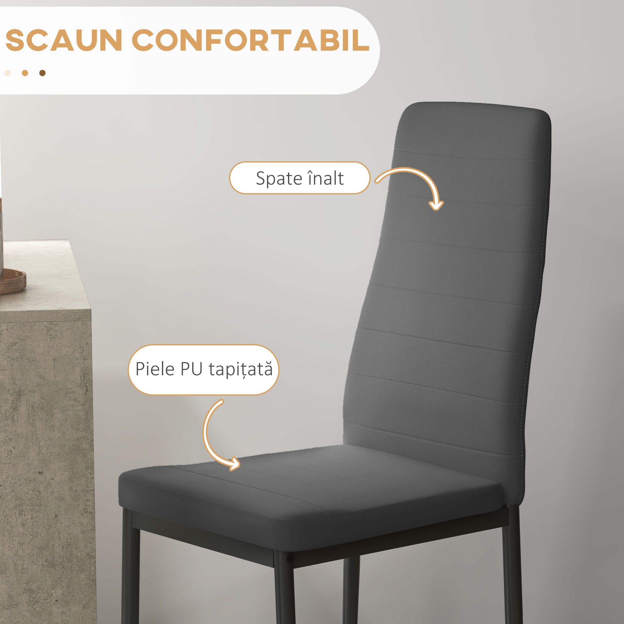 Setul nostru de masa adauga o nota de stil spatiului dvs. de servit masa, servind ca un punct focal pentru cinele in familie si reuniunile cu prietenii. Masa spatioasa este conceputa pentru a va prezenta felurile de mancare, in timp ce spatarul inalt capitonat pentru sustinere va asigura confort in timpul meselor si conversatiilor. Sustinute de picioarele din otel solid, scaunele emana stabilitate si calitate. Cufundati-va in combinatia perfecta de stil, calitate si confort cu setul nostru pentru sufragerie.