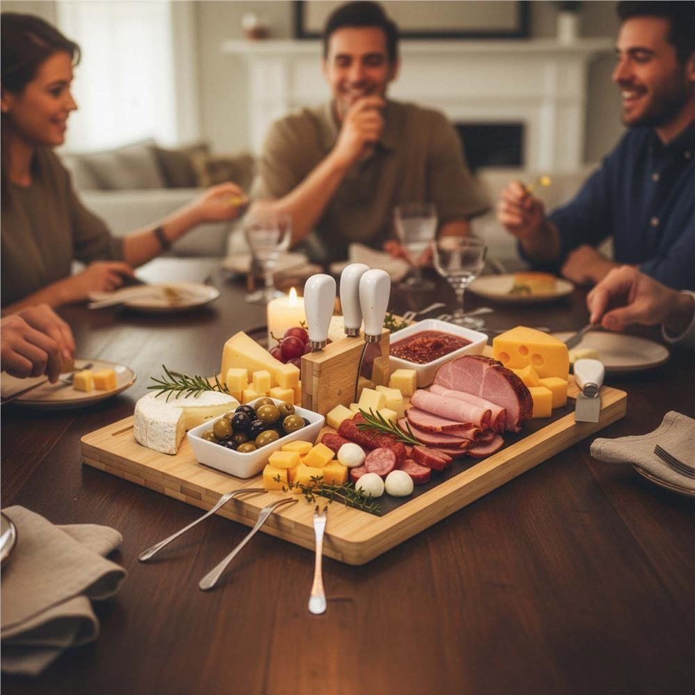 Setul pentru servirea branzeturilor este o alegere practica si eleganta pentru mese festive, gustari sau seri cu aperitive. Platoul din bambus este completat de o insertie din piatra, 2 boluri din portelan si un set de accesorii utile pentru servire. Suportul magnetic pastreaza cutitele la indemana si ajuta la organizarea eficienta a intregului ansamblu.